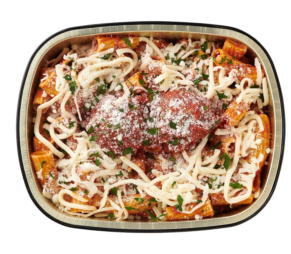 Rigatoni pasta tossed in marinara sauce creamy shredded mozzarella cheese all beef meatballs finished with pecorino romano cheese and fresh parsley.