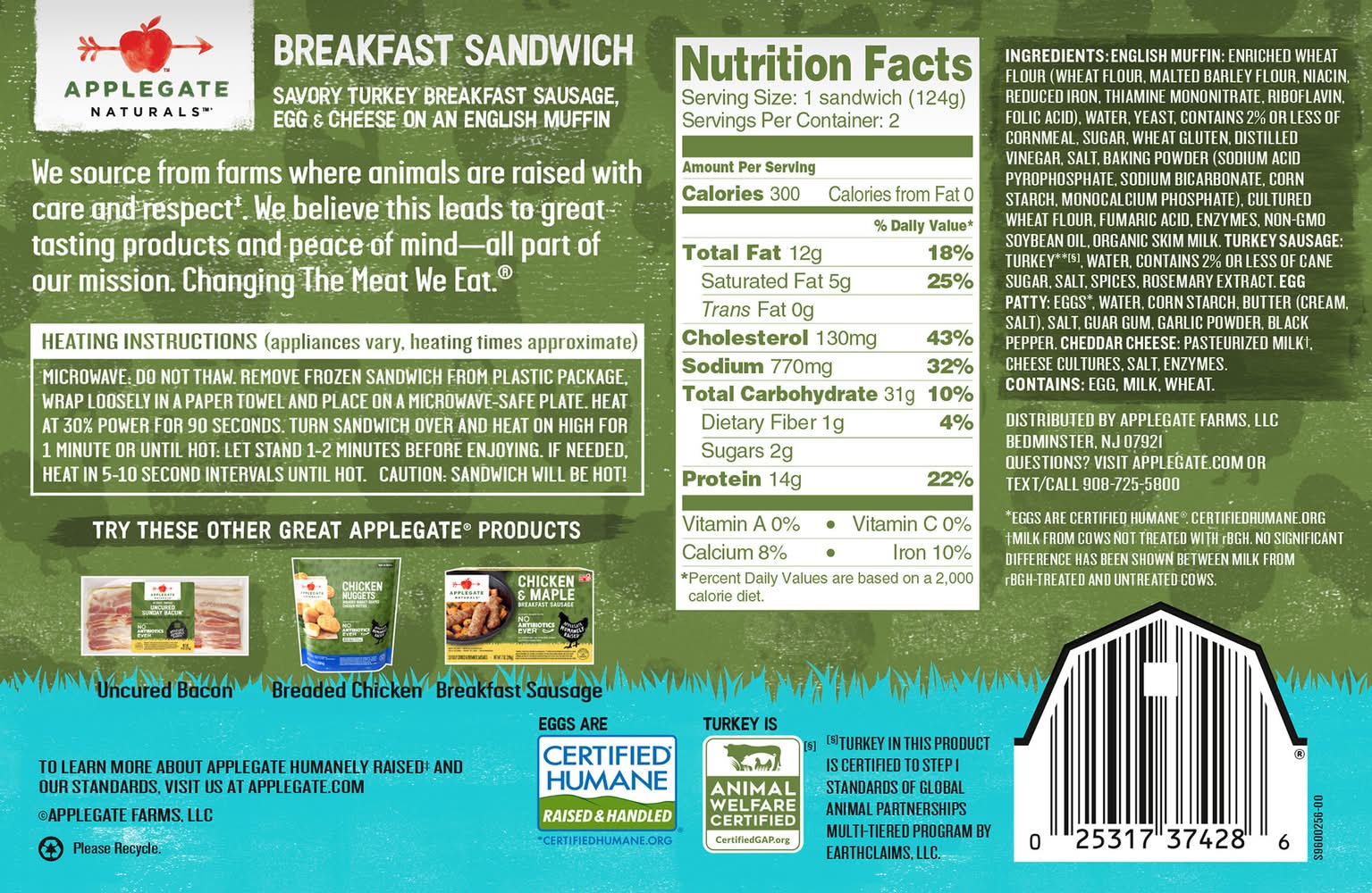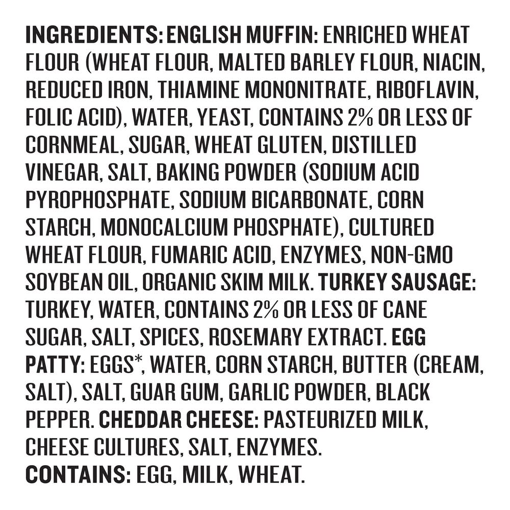 Ingredients: English Muffin: Enriched Wheat Flour (Wheat Flour, Malted Barley Flour, Niacin, Reduced Iron, Thiamine Mononitrate, Riboflavin, Folic Acid), Water, Yeast, Contains 2% or Less of Cornmeal, Sugar, Wheat Gluten, Distilled Vinegar, Salt, Baking Powder (Sodium Acid Pyrophosphate, Sodium Bicarbonate, Corn Starch, Monocalcium Phosphate), Cultured Wheat Flour, Fumaric Acid, Enzymes, Non-GMO Soybean Oil, Organic Skim Milk, Turkey Sausage: Turkey**(a), Water, Contains 2% or Less of Cane Sugar, Salt, Spices, Rosemary Extract, Egg Patty: Eggs*, Water, Corn Starch, Butter (Cream, Salt), Salt, Guar Gum, Garlic Powder, Black Pepper. Cheddar Cheese: Pasteurized Milk(a), Cheese Cultures, Salt, Enzymes. (a) Turkey in This Product is Certified to Step I Standards of Global Animal Partnerships Multi-Tiered Program by Earthclaims, LLC. (B) Milk from Cows Not Treated with rBGH. No Significant Difference Has Been Shown Between Milk from rBGH-Treated and Untreated Cows. * Eggs Are Certified Humane, Certifiedhumane, Org. ** Turkey Never Administered Antibiotics, Added Growth Hormones, or Fed Animal By-Products, Federal Regulations Prohibit the Use of Added Hormones in Poultry Contains: Eggs, Milk, Wheat, Barley, Corn, Gluten, Soybeans