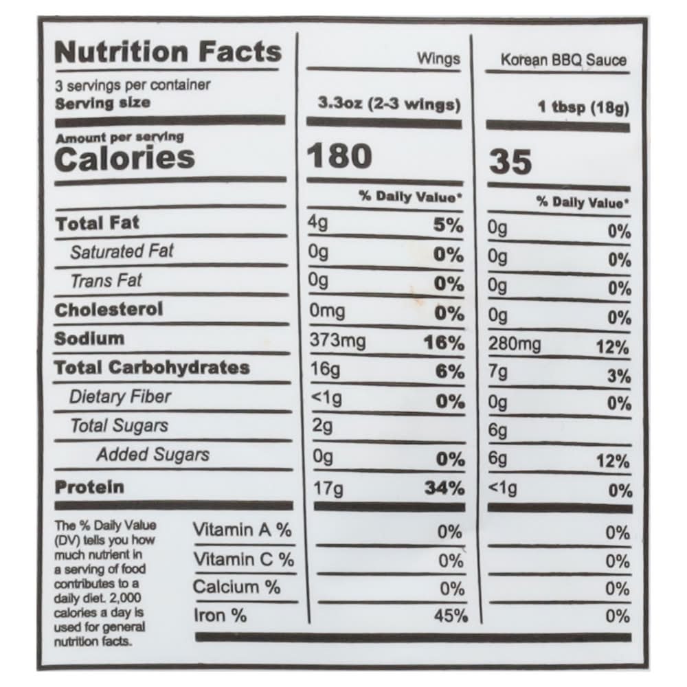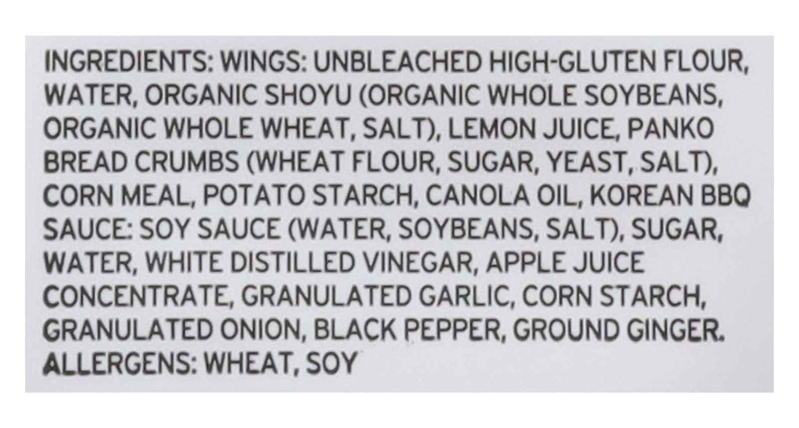 Ingredients: Wings: Unbleached High-Gluten Flour, Water, Organic Shoyu (Organic Whole Soybeans, Organic Whole Wheat, Salt), Lemon Juice, Panko Bread Crumbs (Wheat Flour, Sugar, Yeast, Salt), Corn Meal, Potato Starch, Canola Oil, Korean Bbq Sauce: Soy Sauce (Water, Soybeans, Salt), Sugar, Water, White Distilled Vinegar, Apple Juice Concentrate, Granulated Garlic, Corn Starch, Granulated Onion, Black Pepper, Ground Ginger Contains: Wheat, Soybeans, Gluten, Corn
