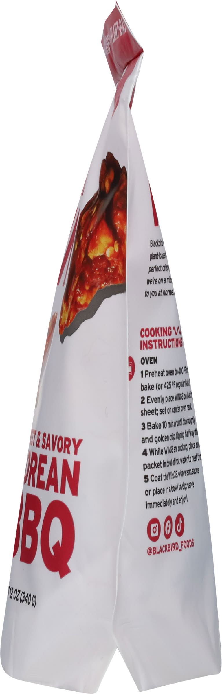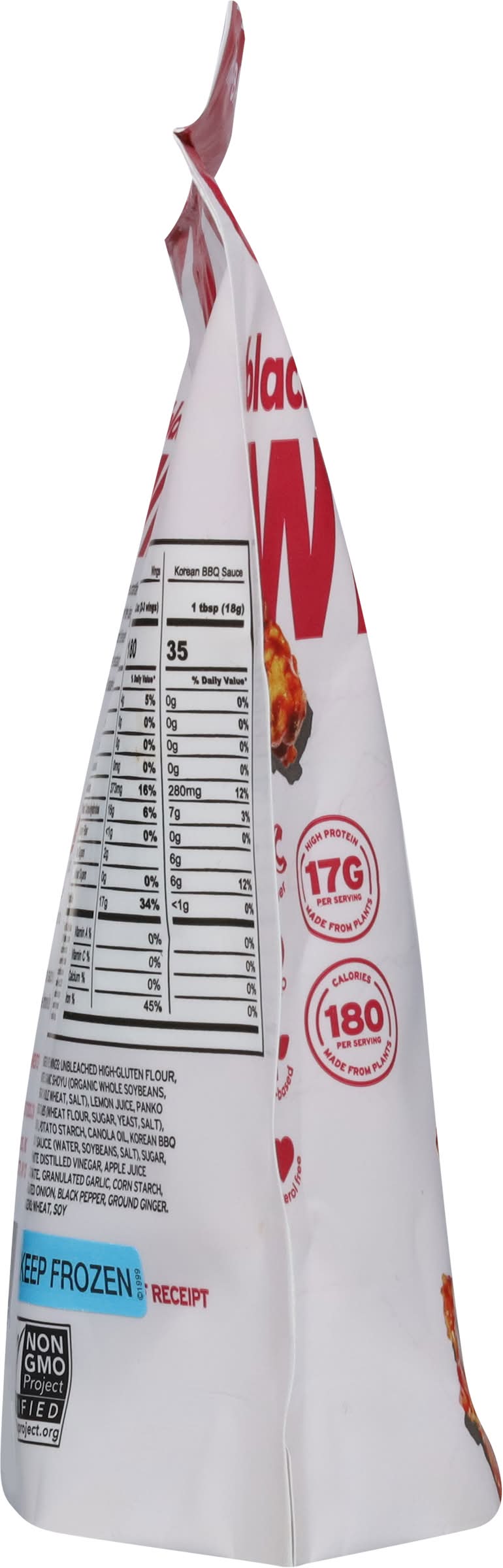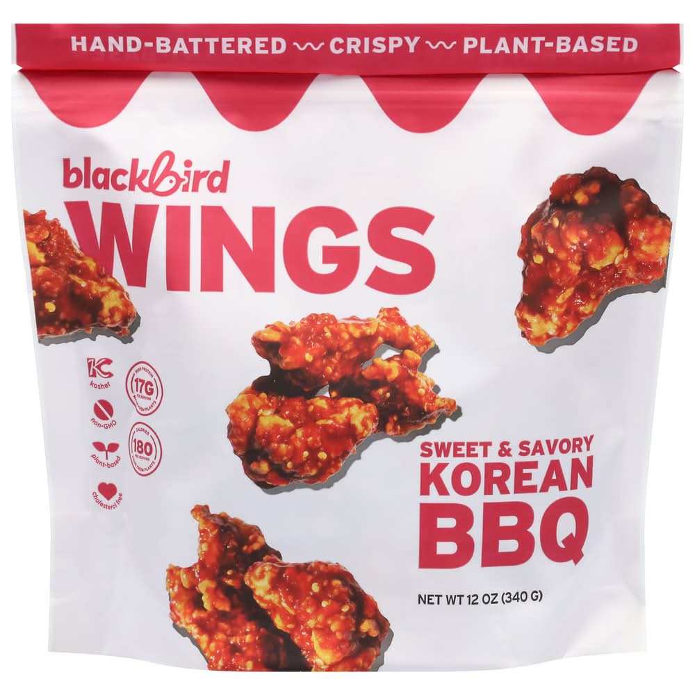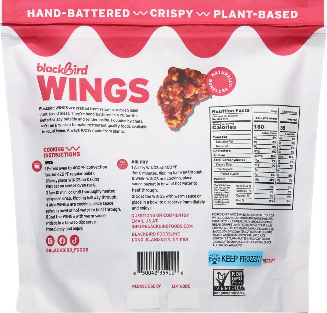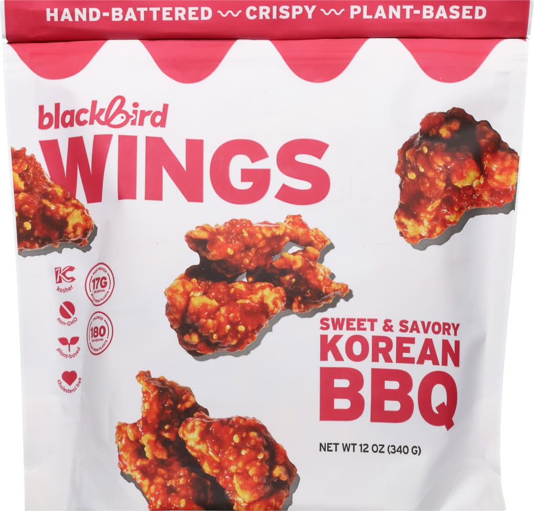 Blackbird korean bbq wings high protein, chef crafted, and made from seitan for a crispy, meaty, plant based bite. Fully breaded with a sweet and savory korean bbq sauce packet included in the bag. Ready to heat simply bake or air fry. A delicious go to alternative for traditional chicken wings. Flavor: Sweet & savory korean bbq