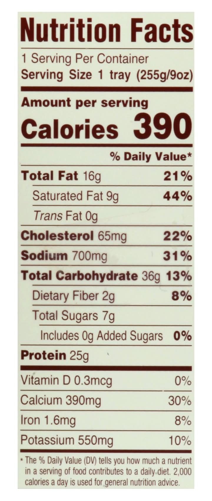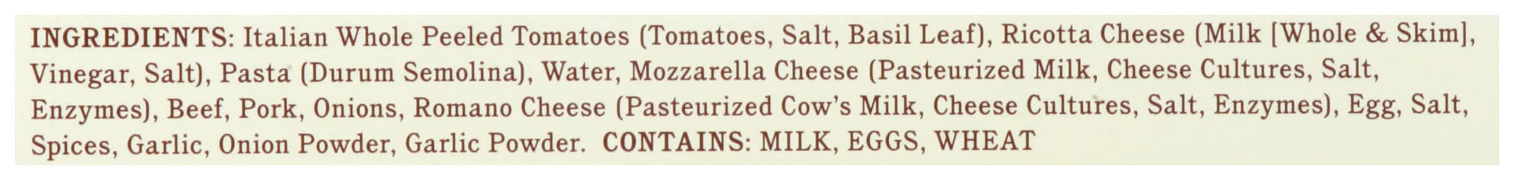 Ingredients: Italian Whole Peeled Tomatoes (Tomatoes Salt Basil Leaf), Pasta (Durum Semolina), Ricotta Cheese (Milk [Whole & Skim] Vinegar Salt), Water, Mozzarella Cheese (Pasteurized Part Skim Milk Cheese Cultures Salt Enzymes), Beef, Pork, Romano Cheese (Pasteurized Cow's Milk Cheese Cultures Salt Enzymes), Onions, Egg, Olive Oil, Salt, Spices, Garlic, Onion Powder, Garlic Powder Contains: Milk, Eggs, Wheat