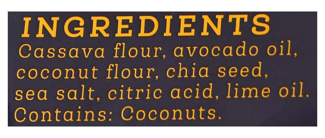 Ingredients: Cassava Flour, Avocado Oil, Coconut Flour, Chia Seeds, Sea Salt, Citric Acid, Lime Oil Contains: Tree Nuts