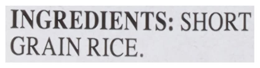 Ingredients: Short grain rice Contains: NONE AS DEFINED BY FDA FALCPA