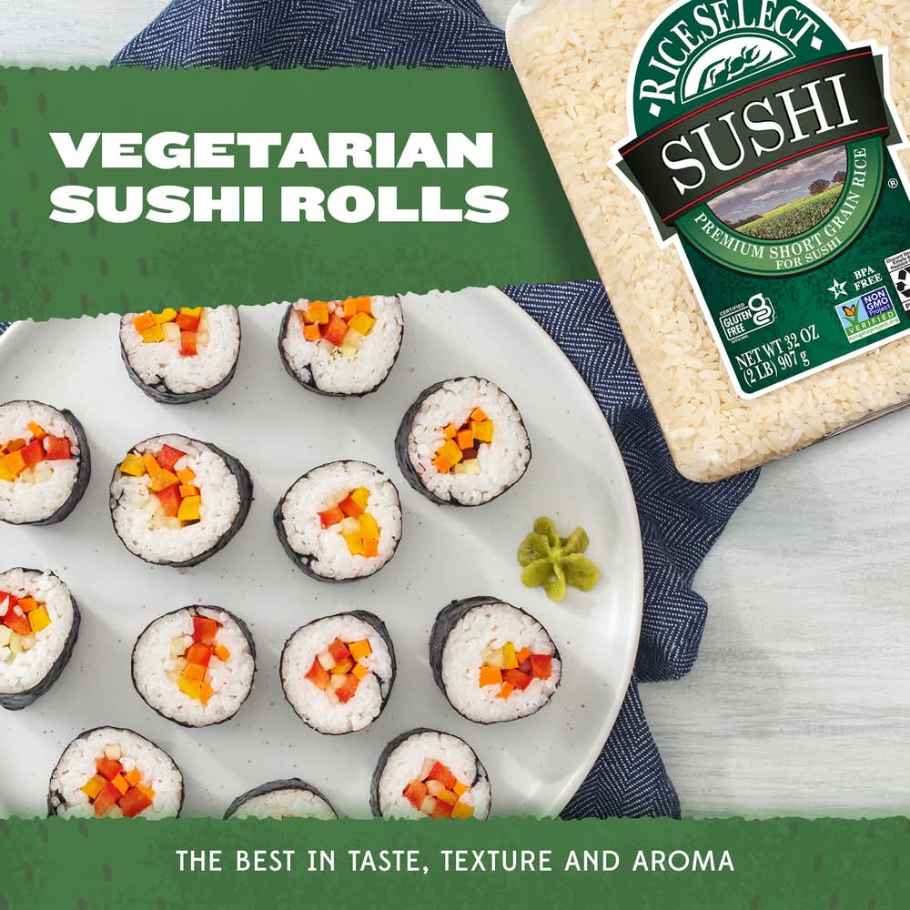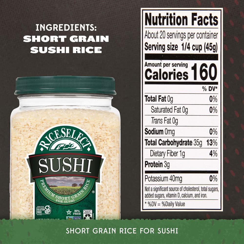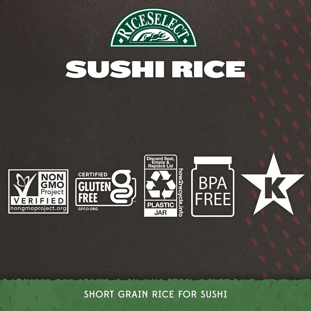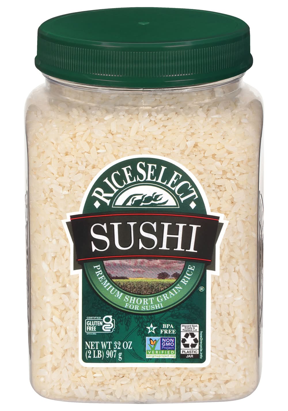 Rice Select Short Grain Sushi Rice comes in a 32 oz jar, offering a quality short grain rice that is ideal for sushi preparation. It is certified gluten-free and has been verified by the Non-GMO Project, ensuring that it meets specific standards for non-GMO foods. The packaging is BPA free, highlighting a commitment to consumer health and safety. Riviana Foods Inc., Houston, TX, 77019, USA