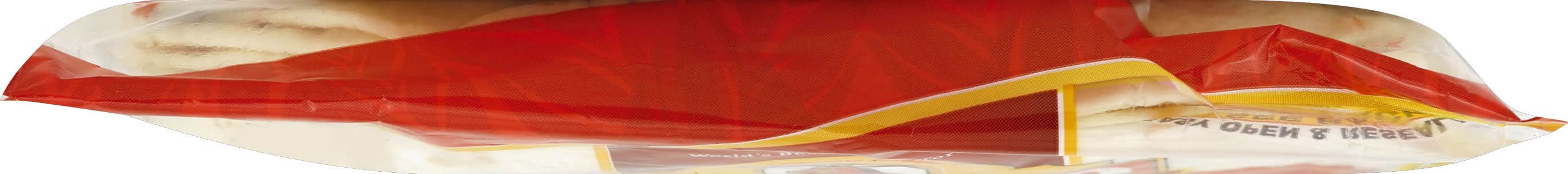 Ingredients: Enriched Bleached Wheat Flour (Wheat Flour, Niacin, Reduced Iron, Thiamine Mononitrate, Riboflavin, Folic Acid), Water, Vegetable Shortening (Interesterified Soybean Oil, Hydrogenated Soybean Oil and/or Palm Oil), Contains 2% or Less of: Sugar, Salt, Leavening (Sodium Bicarbonate, Sodium Aluminum Sulfate, Corn Starch, Monocalcium Phosphate and/or Sodium Acid Pyrophosphate, Calcium Sulfate), Distilled Monoglycerides, Enzymes, Wheat Starch, Calcium Carbonate, Antioxidants (Tocopherols, Ascorbic Acid, Citric Acid), Cellulose Gum, Guar Gum, Calcium Propionate and Sorbic Acid (to Preserve Freshness), Dough Conditioners (Fumaric Acid, Sodium Metabisulfite and/or Mono- and Diglycerides) Contains: Soybeans, Wheat