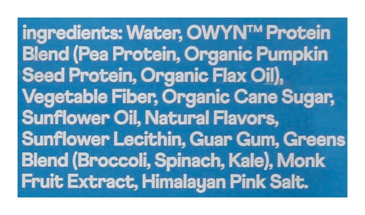 Ingredients: Water, OWYN Protein Blend (Pea Protein, Organic Pumpkin Seed Protein, Organic Flax Oil), Soluble Fiber, Organic Cane Sugar, Sunflower Oil, Natural Flavors, Sunflower Lecithin, Guar Gum, Greens Blend (Broccoli, Spinach, Kale), Monk Fruit Extract, Himalayan Pink Sea Salt