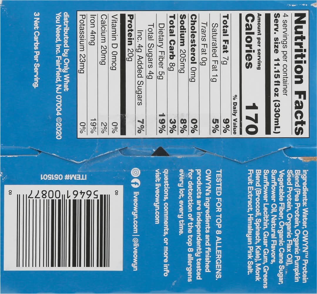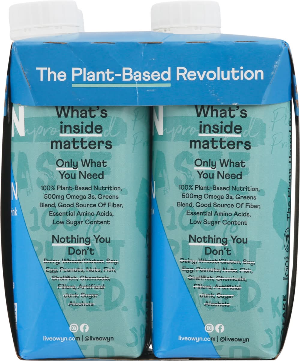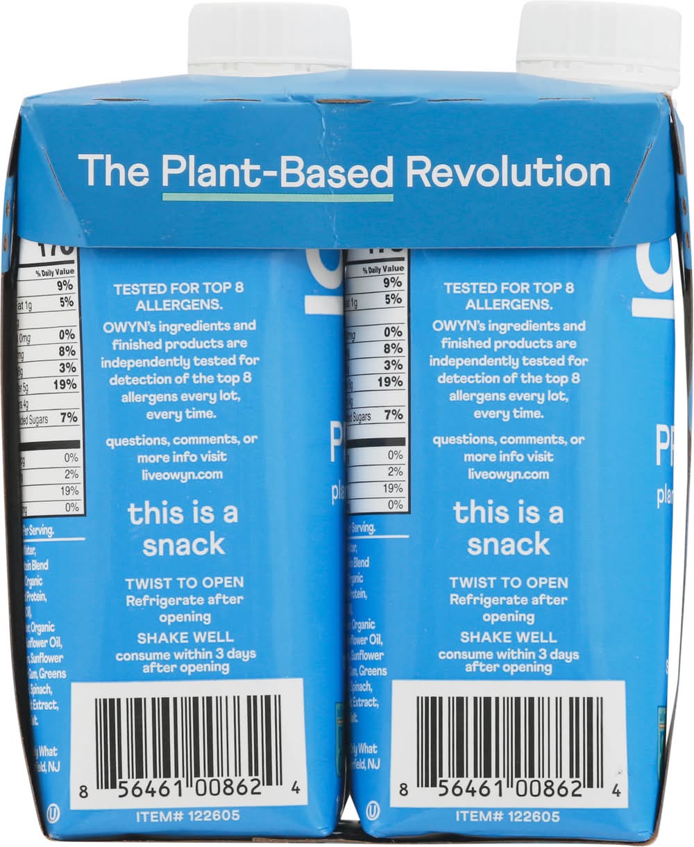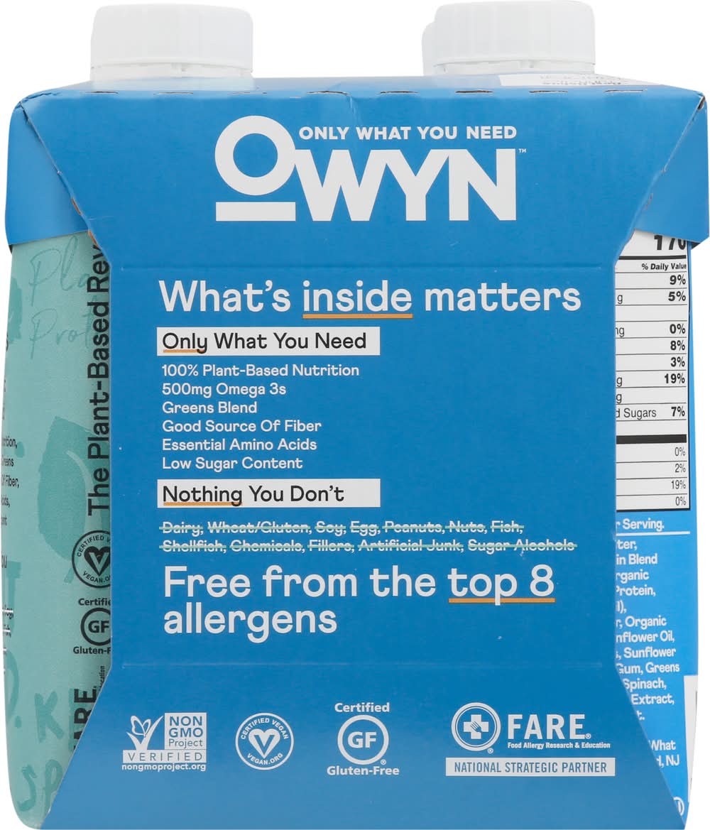 Smooth vanilla with other natural flavors. 20 g protein. 3 g net carbs. Allergy friendly: No dairy, soy, peanut, tree nuts, wheat/gluten. Certified Vegan. Certified Gluten-Free. Good source of fiber. Low sugar content. Non GMO Project verified. We milk plants not cows. What's inside matters. Only What You Need: 100% plant-based nutrition. 500 mg omega 3s. Greens blend. Essential amino acids. Nothing You Don't: Dairy, wheat/gluten, soy, egg, peanuts, nuts, fish, shellfish, fillers, artificial junks, sugar alcohols. Free from the top 8 allergens. The plant-based revolutions. Tested for top 8 allergens. OWYN's ingredients and finished products are independently tested for detection of the top 8 allergens every lot, every time. • Flavor: Smooth vanilla • Pack size: 4