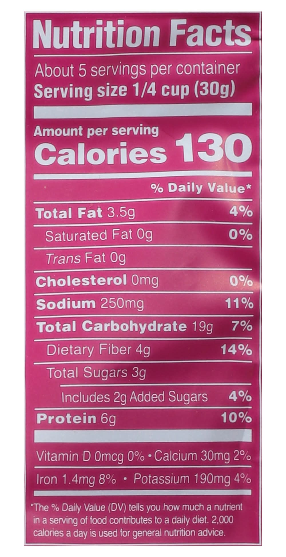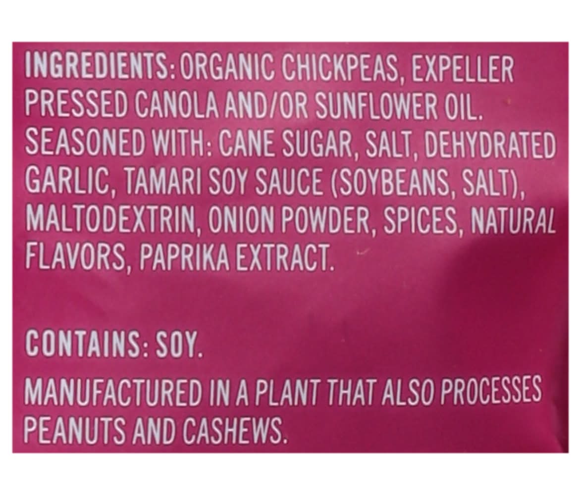 Ingredients: Organic Chickpeas, Expeller Pressed Canola and/or Sunflower Oil, Seasoned with: Cane Sugar, Salt, Dehydrated Garlic, Tamari Soy Sauce (Soybeans, Salt), Maltodextrin, Onion Powder, Spices, Natural Flavors, Paprika Extract Contains: Soybeans, Peanuts, Tree Nuts, Cashews