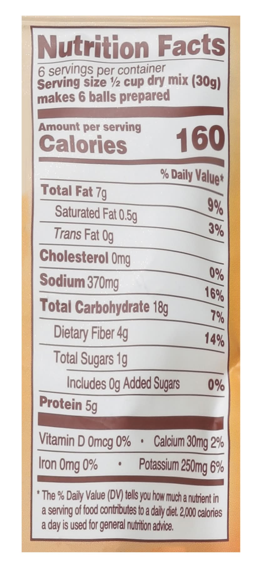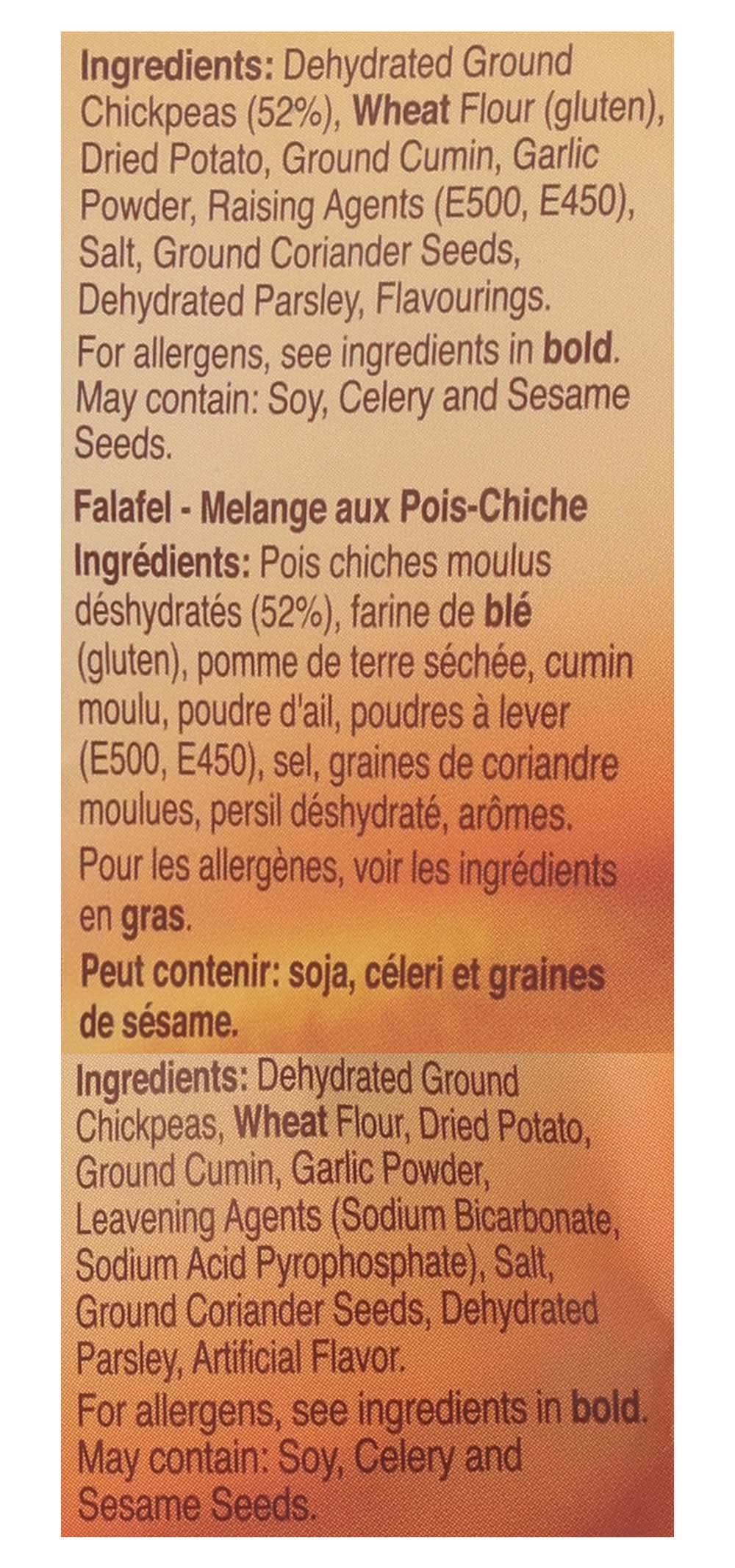 Ingredients: Dehydrated Ground Chickpeas, Wheat Flour, Dried Potato, Ground Cumin, Garlic Powder, Leavening Agents (Sodium Bicarbonate, Sodium Acid Pyrophosphate), Salt, Ground Coriander Seeds, Dehydrated Parsley, Artificial Flavor Contains: Wheat, Soybeans, Celery, Sesame