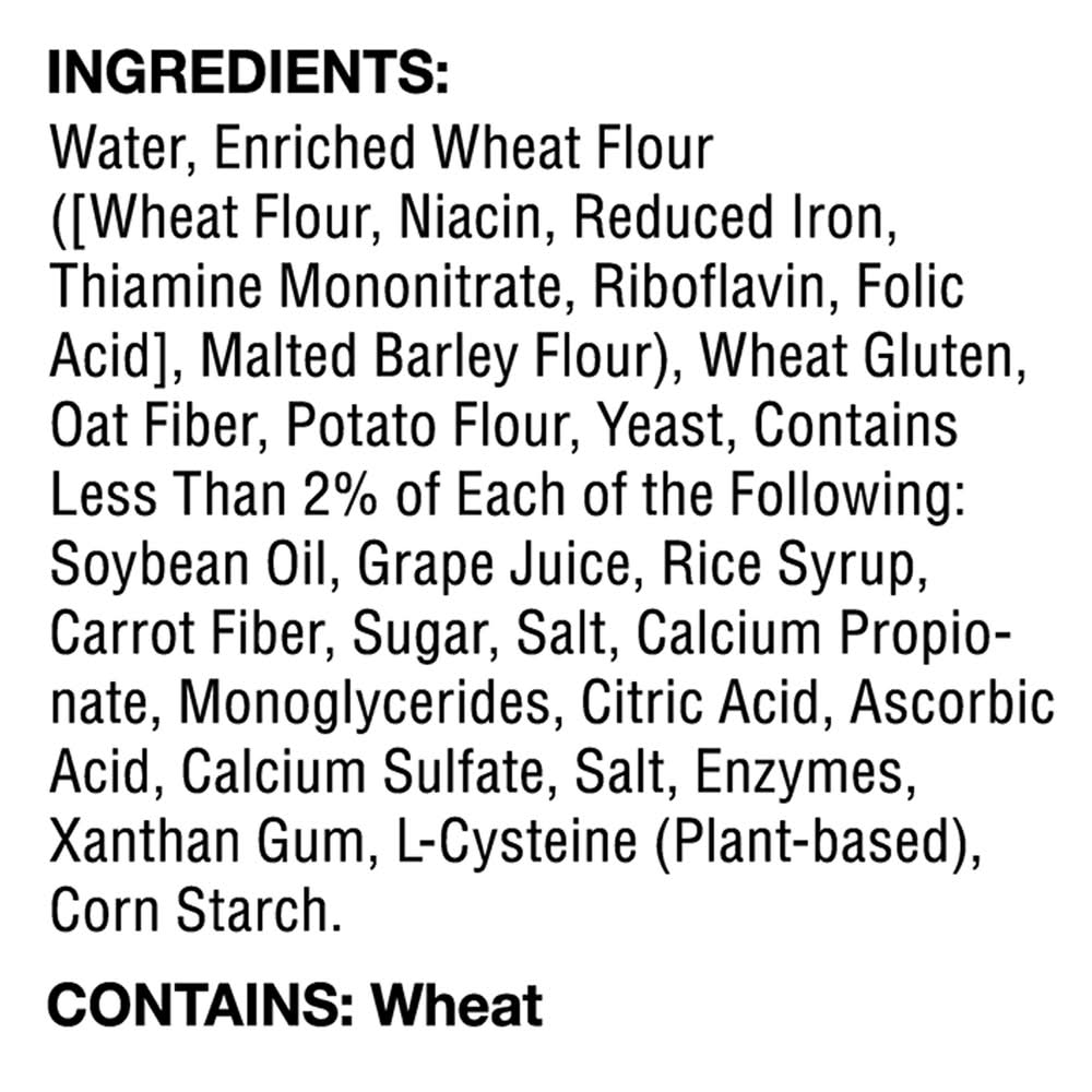 Ingredients: Water, Enriched Wheat Flour ([Wheat Flour, Niacin, Reduced Iron, Thiamine Mononitrate, Riboflavin, Folic Acid], Malted Barley Flour), Wheat Gluten, Oat Fiber, Potato Flour, Yeast, Contains Less than 2% of Each of the Following: Soybean Oil, Grape Juice, Rice Syrup, Carrot Fiber, Sugar, Salt, Calcium Propionate, Monoglycerides, Citric Acid, Ascorbic Acid, Calcium Sulfate, Salt, Enzymes, Xanthan Gum, L-Cysteine (Plant-Based), Corn Starch Contains: Wheat, Barley, Gluten, Oat, Soybeans