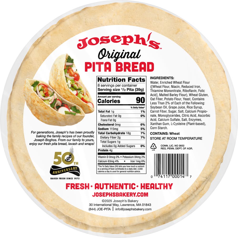 Original Pita combines ancient recipes with family tradition. An authentic bread baked the way pita bread was meant to be, with the classic taste of Joseph’s. Great for flatbread pizzas, roll-ups, sandwiches, appetizer spreads and more. Joseph’s Bakery, a family-owned business led by the third generation, has been making fresh, authentic, and healthy breads for over 50 years. • Flavor: Original • Packaging: Reusable
