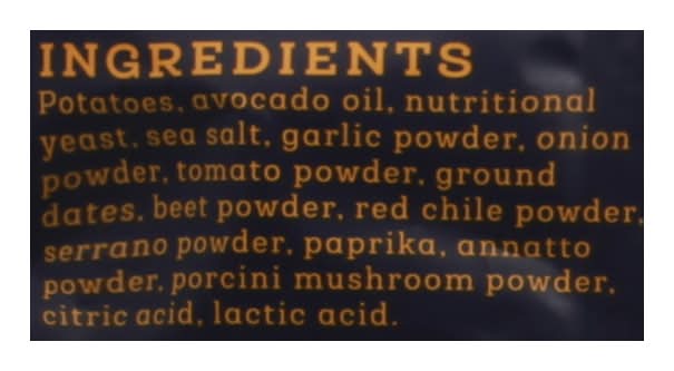 Ingredients: Potatoes, Avocado Oil, Nutritional Yeast, Sea Salt, Garlic Powder, Onion Powder, Tomato Powder, Ground Dates, Beet Powder, Red Chile Powder, Serrano Powder, Paprika, Annatto Powder, Porcini Mushroom, Citric Acid, Lactic Acid Contains: 'Gluten Free From', 'Milk Free From', 'Soybeans Free From'