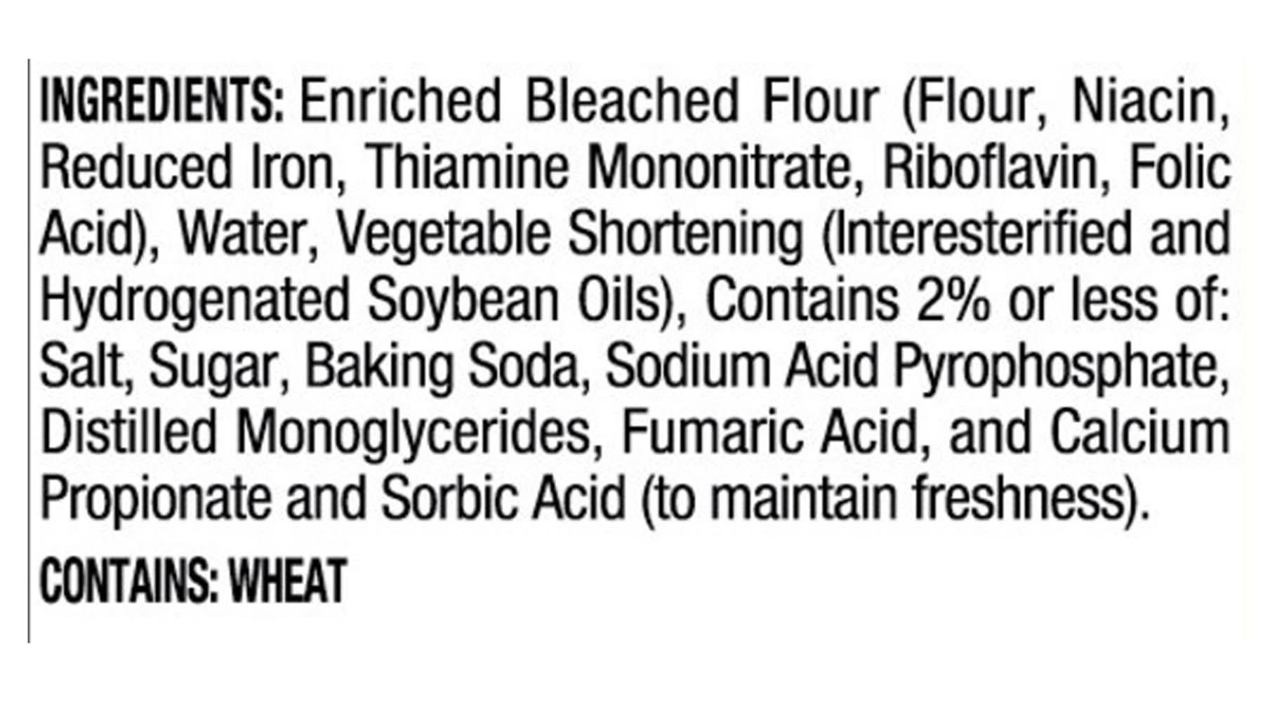 Ingredients: Enriched Bleached Flour (Flour, Niacin, Reduced Iron, Thiamine Mononitrate, Riboflavin, Folic Acid), Water, Vegetable Shortening (Interesterified and Hydrogenated Soybean Oils), Contains 2% or Less of: Salt, Sugar, Baking Soda, Sodium Acid Pyrophosphate, Distilled Monoglycerides, Fumaric Acid, and Calcium Propionate and Sorbic Acid (to Maintain Freshness) Contains: Wheat, Soybeans
