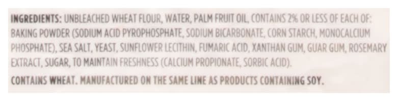 Ingredients: Unbleached Wheat Flour, Water, Palm Fruit Oil, Contains 2% or Less of Each of Baking Powder (Sodium Acid Pyrophosphate, Sodium Bicarbonate, Corn Starch, Monocalcium Phosphate), Sea Salt, Yeast, Sunflower Lecithin, Fumaric Acid, Xanthan Gum, Guar Gum, Rosemary Extract, Sugar, to Maintain Freshness (Calcium Propionate, Sorbic Acid) Contains: Wheat, Corn, Soybeans