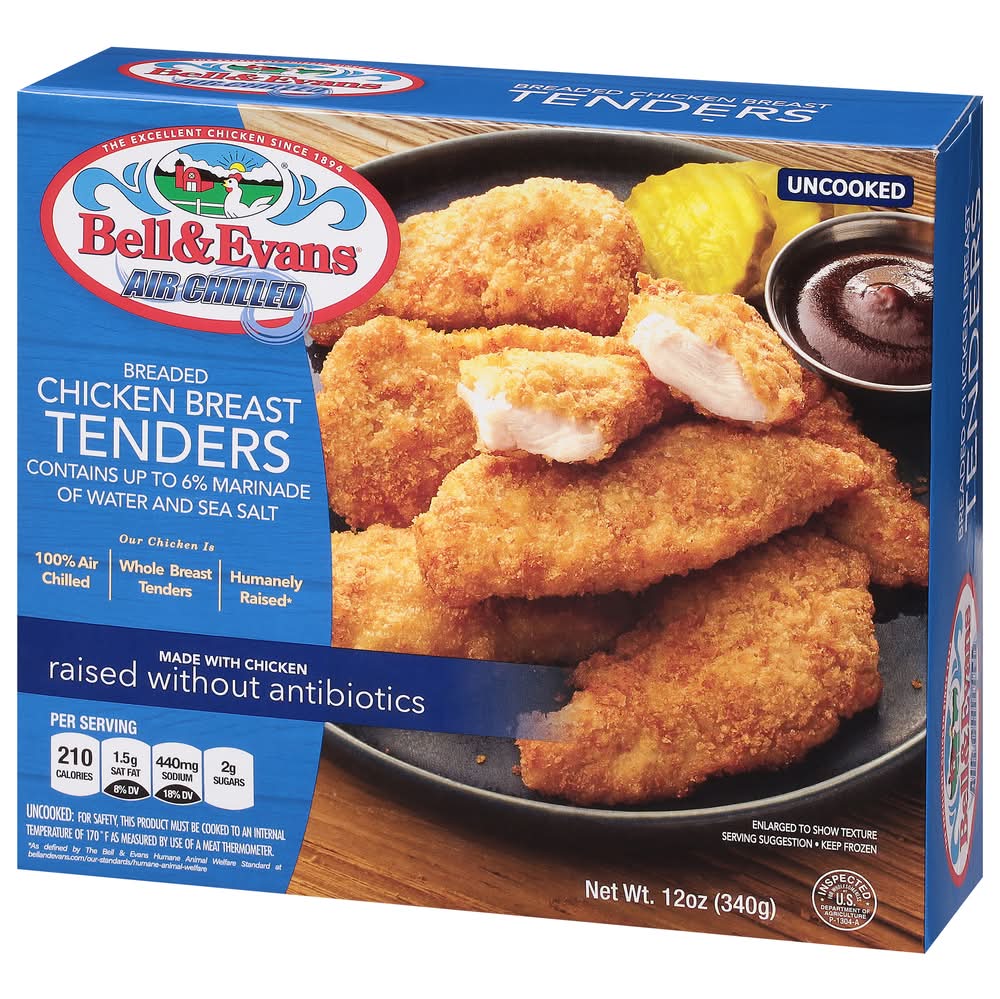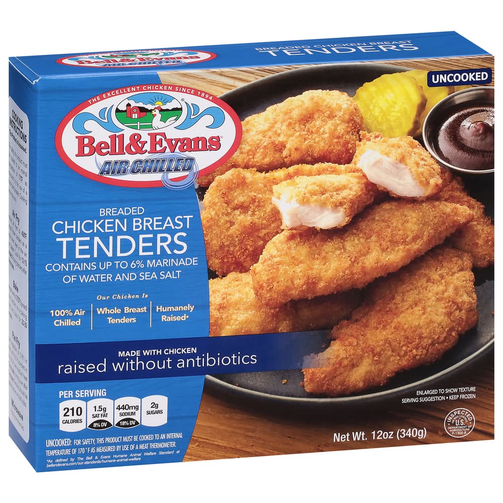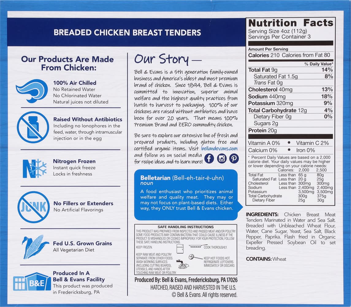 The excellent chicken since 1894. Air chilled. Our Chicken Is: 100% air chilled; whole breast tenders; humanely raised (As defined by The Bell & Evans Humane Animal Welfare Standard at bellandevans.com/our-standards/humane-animal-welfare). Our Products Are Made From Chicken: 100% Air Chilled: No retained water; No chlorinated water; Natural juices not diluted. Raised Without Antibiotics including no lonophores in the feed, water, through intramuscular injection or in the egg. Nitrogen Frozen: Instant quick freeze; Locks in freshness. No Fillers or Extenders: No artificial flavorings. Fed U.S. Grown Grains: All vegetarian diet. Produced In A Bell & Evans Facility: This product was produced in Fredericksburg, PA. Our Story - Bell & Evans is a 5th generation family-owned business and America's oldest and most premium brand of chicken. Since 1894, Bell & Evans is committed to innovation, superior animal welfare and the highest quality practices from hatch to harvest to packaging. 100% of our chickens are raised without antibiotics and have been for over 20 years. That means 100% Premium Brand and zero commodity chicken. Belletarian (Bell-eh-tair-e-uhn) noun A food enthusiast who prioritizes animal welfare and quality meat. They may or may not focus on plant-based diets. Either way, they only trust Bell & Evans chicken.