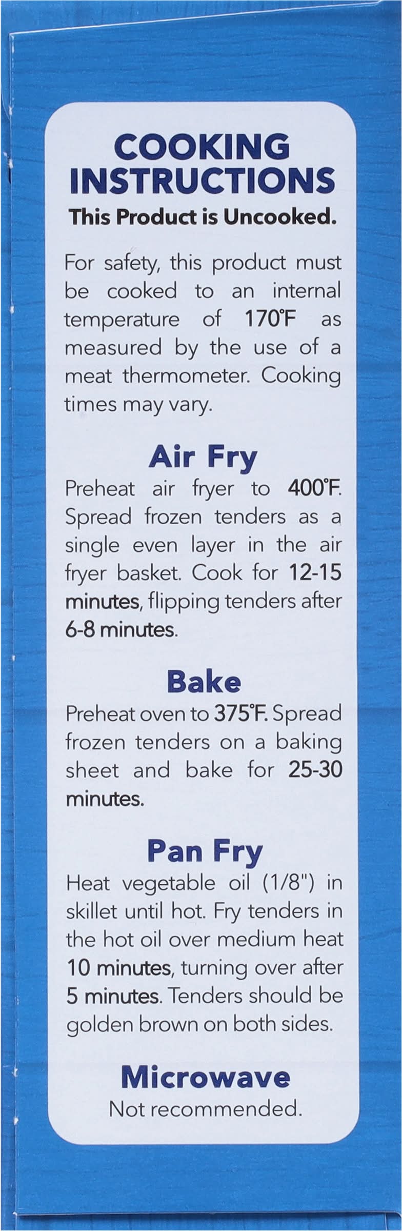For safety, this product must be cooked to an internal temperature of 170 degrees f. as measured by use of a meat thermometer. keep frozen. boxed breaded tenders are uncooked. for safety, this product must be cooked to an internal temperature of 170 degrees f as measured by use of a meat thermometer. cooking times may vary. suggested cooking instructions: preheat the oven to 375 degrees. spread frozen tenders on a baking sheet and bake for a total of 25-30 minutes. pan fry: heat vegetable oil (1/8 in) in the skillet until hot. fry in the hot oil over medium heat 10 minutes, turning over after 5 minutes. tenders should be golden brown on both sides. microwave: not recommended. safe handling instructions: this product was prepared from inspected and passed meat and/or poultry. some food products may contain bacteria that could cause illness if the product is mishandled or cooked improperly. for your protection, follow these safe handling instructions. keep frozen. keep raw meat and poultry separate from other foods. wash working surfaces (including cutting boards), utensils, and hands after touching raw meat or poultry. cook thoroughly. keep hot foods hot. refrigerate leftovers immediately or discard.