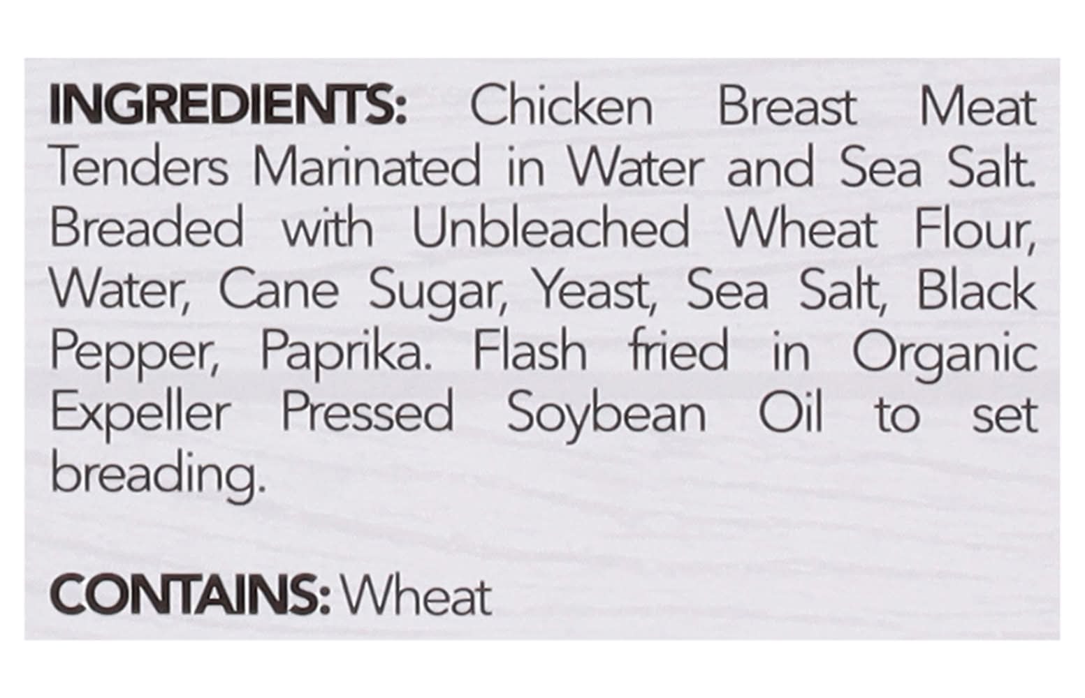 Ingredients: Chicken Breast Meat Tenders Marinated in Water and Sea Salt, Breaded with Unbleached Wheat Flour, Water, Cane Sugar, Yeast, Sea Salt, Black Pepper, Paprika, Flash Fried in Organic Expeller Pressed Soybean Oil to Set Breading Contains: Milk, Soybeans