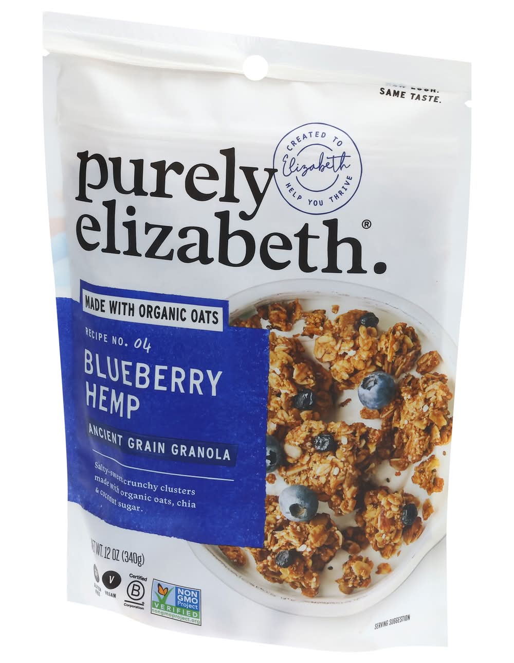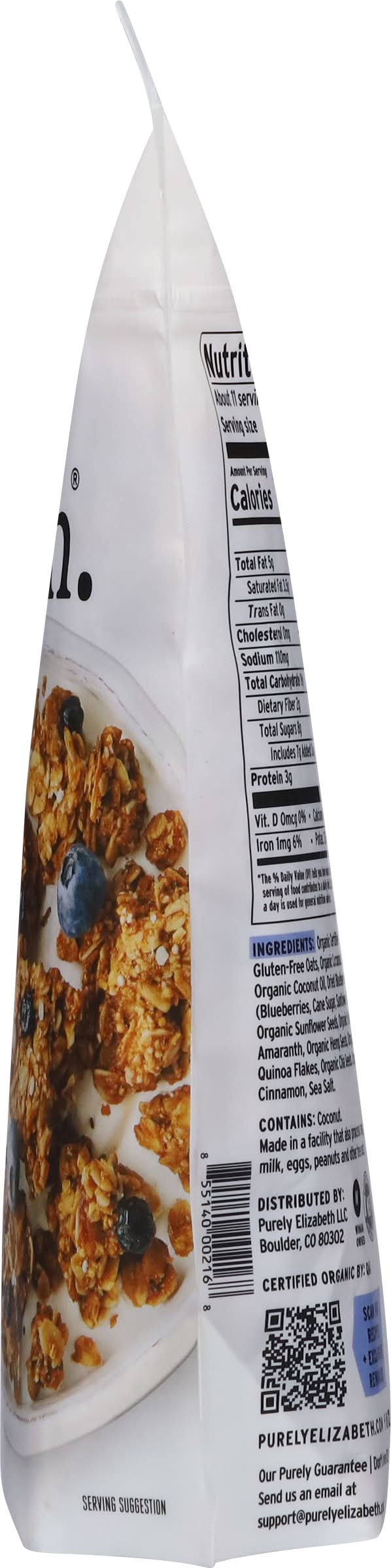 Full of the Good Stuff We select each ingredient for its taste, texture and nutrition to create products you will obsess over! Our Ancient Grain Granola blend is made with organic oats, chia and sustainably sourced coconut sugar. • Flavor: Blueberry hemp • Purely Elizabeth Llc, Boulder, CO, 80301