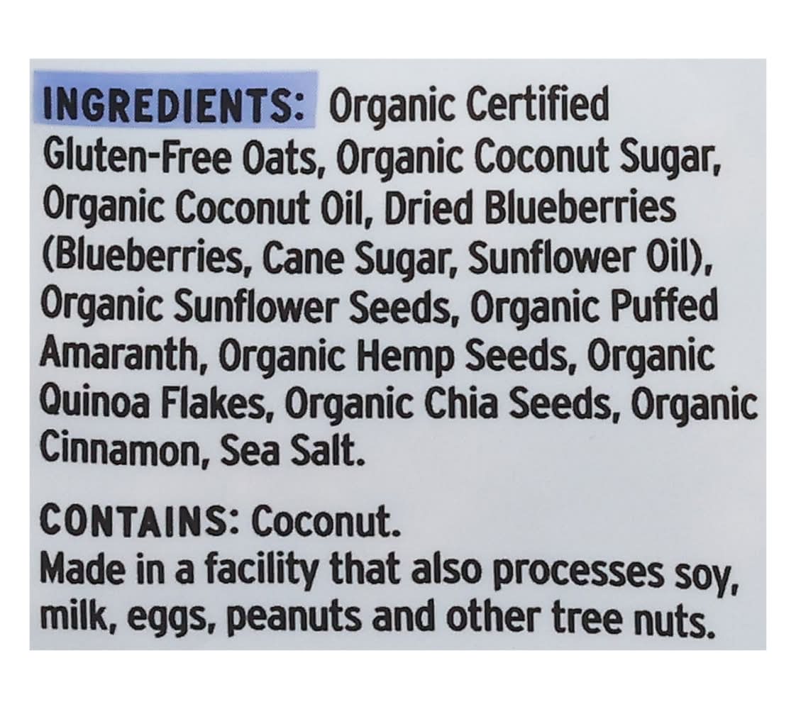 Ingredients: Organic Certified Gluten-Free Oats, Organic Coconut Sugar, Organic Coconut Oil, Dried Blueberries (Blueberries, Cane Sugar, Sunflower Oil), Organic Sunflower Seeds, Organic Puffed Amaranth, Organic Hemp Seeds, Organic Quinoa Flakes, Organic Chia Seeds, Organic Cinnamon, Sea Salt Contains: Tree Nuts, Coconuts, Oat, Soybeans, Milk, Eggs, Peanuts, Tree Nuts