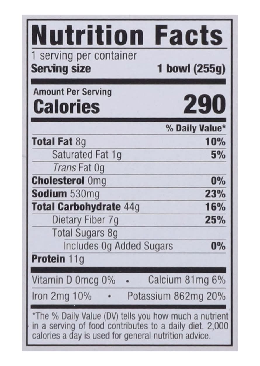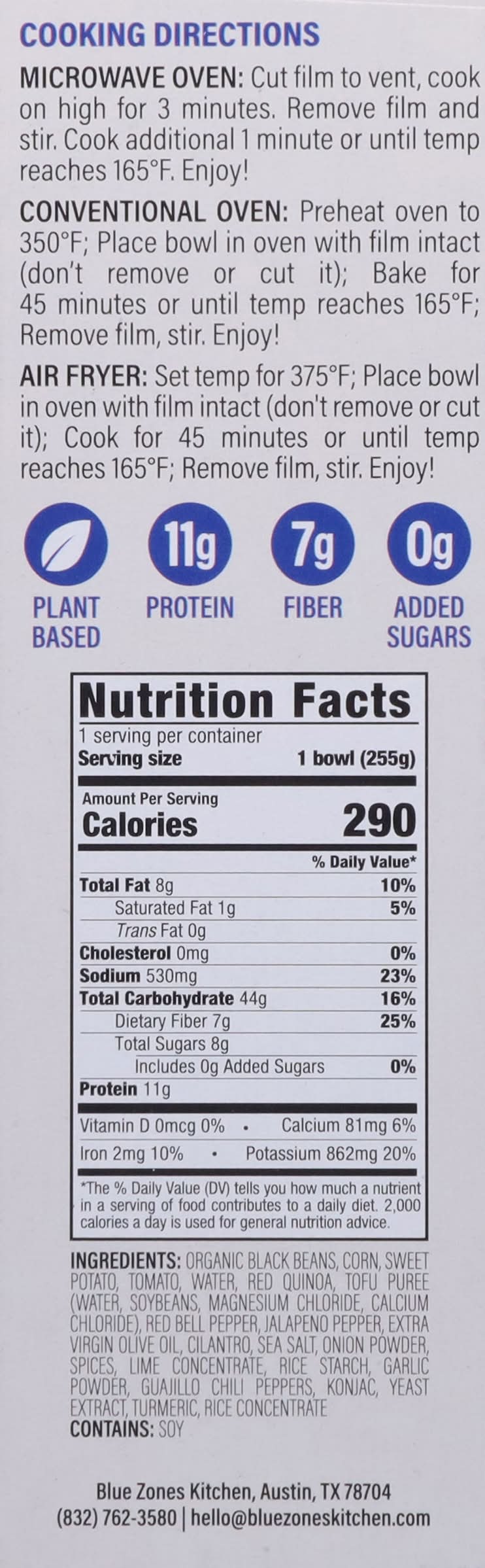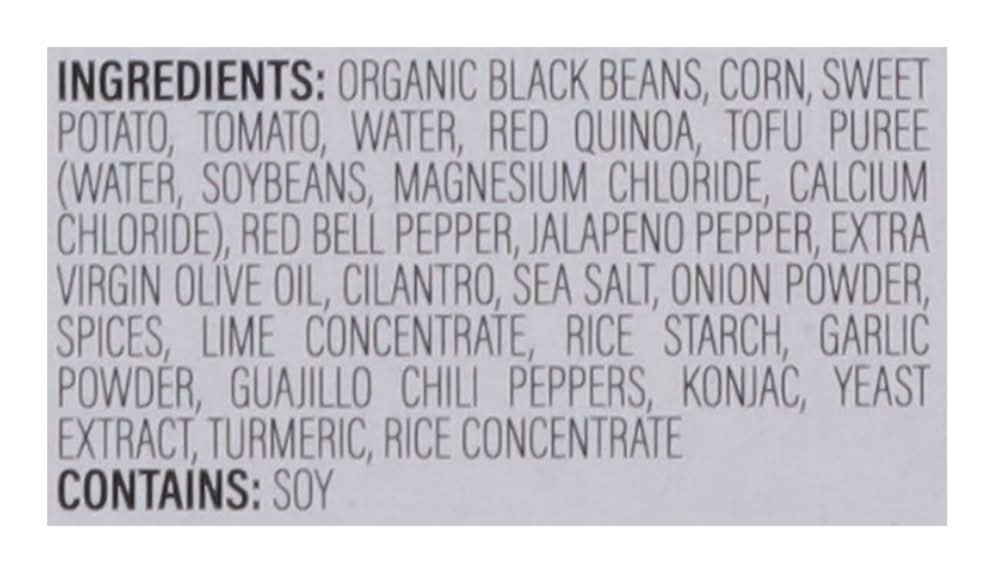 Ingredients: Organic Black Beans, Corn, Sweet Potato, Tomato, Water, Red Quinoa, Tofu Puree (Water, Soybeans, Magnesium Chloride, Calcium Chloride), Red Bell Pepper, Jalapeno Pepper, Extra Virgin Olive Oil, Cilantro, Sea Salt, Onion Powder, Spices, Lime Concentrate, Rice Starch, Garlic Powder, Guajillo Chili Peppers, Konjac, Yeast Extract, Turmeric, Rice Concentrate Contains: Soybeans, Corn