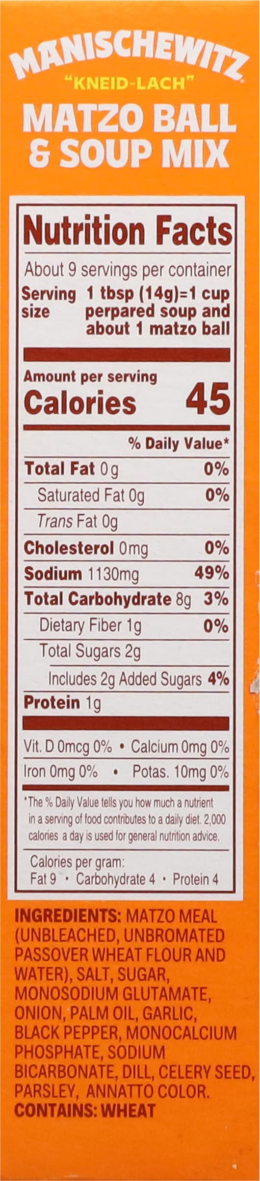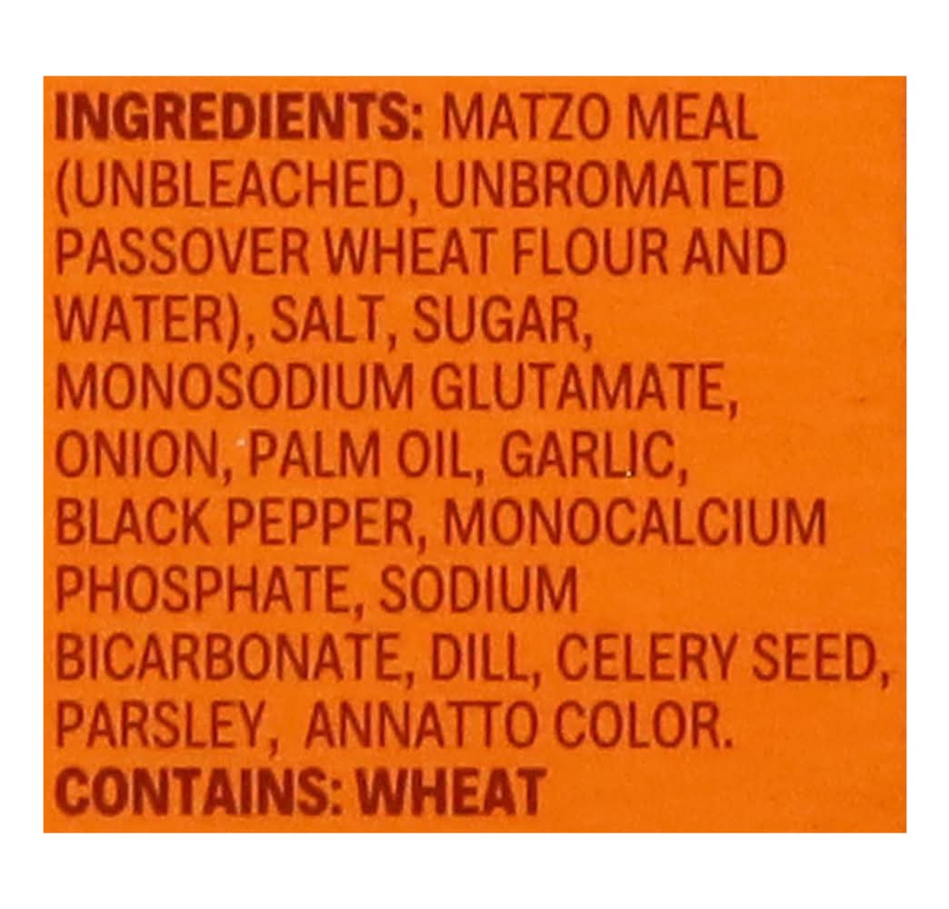 Ingredients: Matzo Meal (Unbleached, Unbromated Passover Wheat Flour and Water), Salt, Sugar, Monosodium Glutamate, Onion, Palm Oil, Garlic, Black Pepper, Monocalcium Phosphate, Sodium Bicarbonate, Dill, Celery Seed, Parsley, Annatto Color Contains: Wheat, Celery