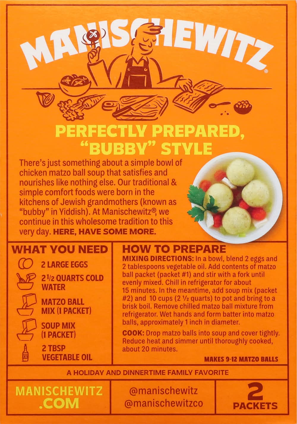 How to prepare: 2 tbsp vegetable oil; 2 large eggs; matzo ball mix 1 packet; soup mix 1 packet; 10 c cold water 2-1/2 quarts, each packet makes 9-12 matzo balls, directions: in a bowl, blend 2 eggs and 2 tablespoons vegetable oil, add contents of matzo ball packet (packet (no. 1) and stir with a fork until evenly mixed, chill in refrigerator for about 15 minutes. in the meantime, add soup mix (packet no. 2) and 10 cups (2-1/2 quarts) to pot and bring to a brisk boil, remove chilled matzo ball mixture from refrigerator, wet hands and form batter into matzo balls, approximately 1 inch in diameter. cook: drop matzo balls into boiling water and cover tightly. reduce heat and simmer until thoroughly cooked, about 20 minutes.