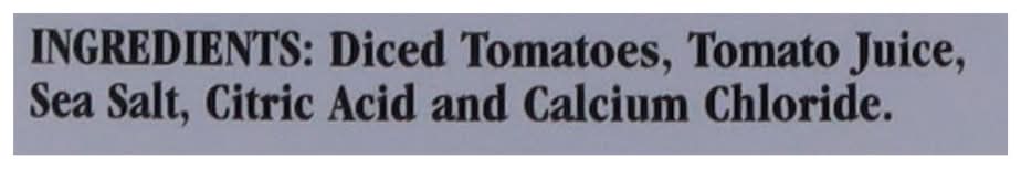 Ingredients: Diced Tomatoes, Tomato Juice, Sea Salt, Citric Acid and Calcium Chloride
