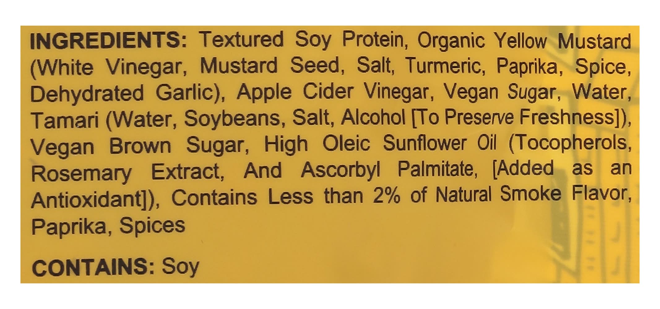 Ingredients: Textured Soy Protein, Organic Yellow Mustard (White Vinegar, Water, Mustard Seed, Salt, Turmeric, Paprika, Spice, Dehydrated Garlic), Apple Cider Vinegar, Vegan Sugar, Water, Tamari (Water, Soybeans, Salt, Alcohol [to Preserve Freshness]), Vegan Brown Sugar, High Oleic Sunflower Oil (Tocopherols, Rosemary Extract, and Ascorbyl Palmitate, [Added as an Antioxidant], Contains Less than 2% of Natural Smoke Flavor, Paprika, Spices Contains: Soybeans, Mustard