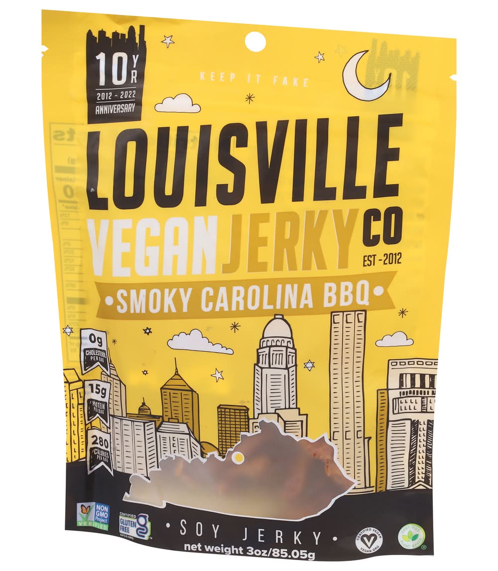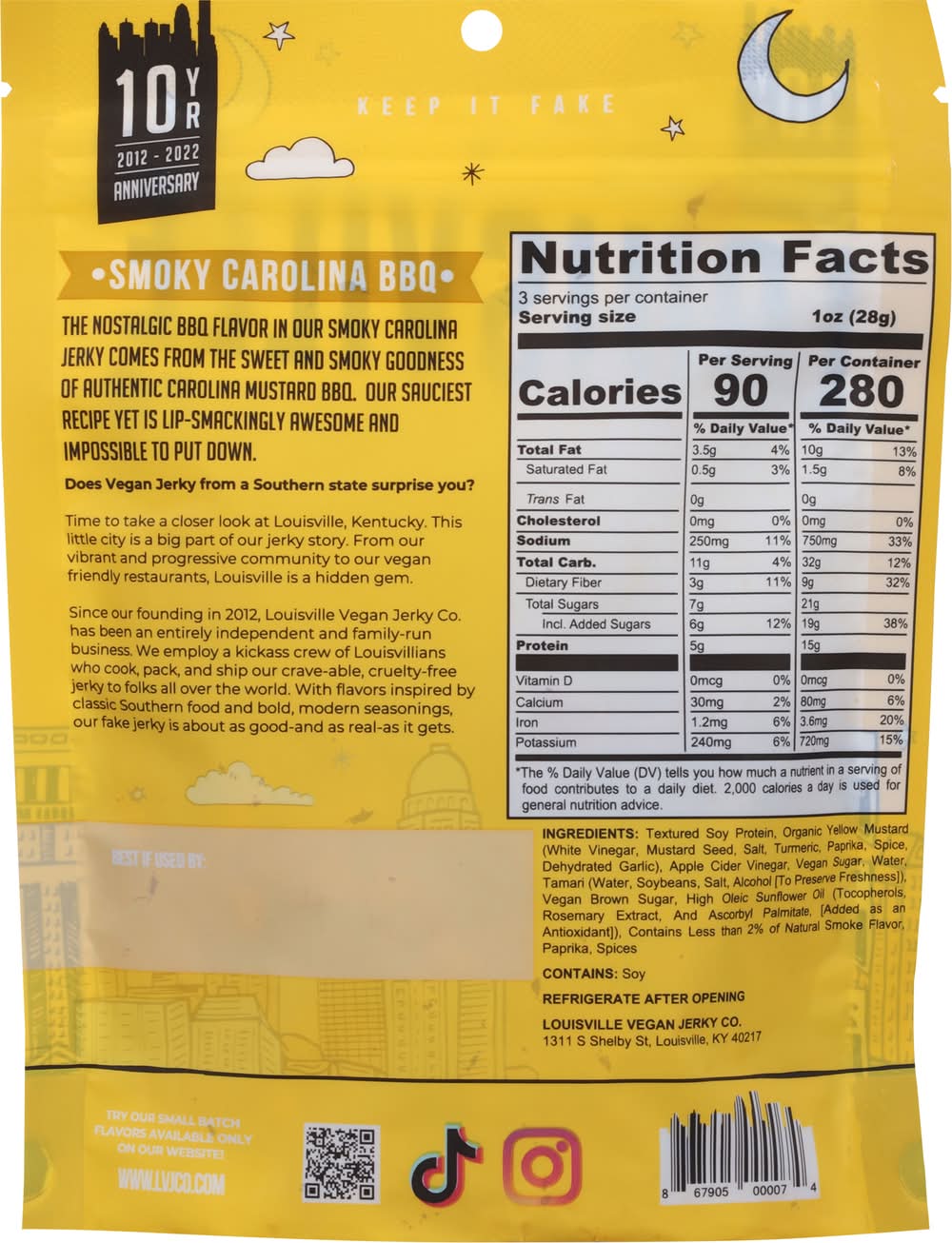 it the classic Southern mustard BBQ. Each bag contains 14 grams of protein and 250 calories, with 0 grams of cholesterol. The product is certified gluten-free, vegan, and plant-based. It also holds Non-GMO Project verification. Crafted with a saucy recipe that delivers a sweet and smoky taste, this jerky is made in Louisville, Kentucky, a city known for its vibrant, progressive community and vegan-friendly options. Established in 2012, Louisville Vegan Jerky Company has been creating plant-based jerky flavors that are inspired by traditional Southern cuisine and contemporary seasoning blends. • Flavor: Smoky carolina bbq • Number of servings: 3