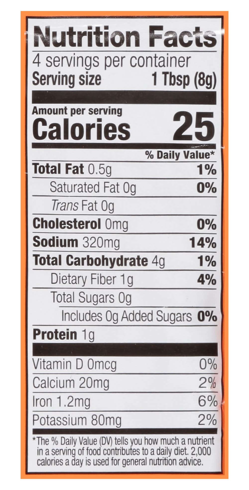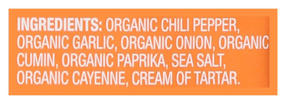 Ingredients: Organic Chili Pepper, Organic Garlic, Organic Onion, Organic Cumin, Organic Paprika, Sea Salt, Organic Cayenne, Cream of Tartar