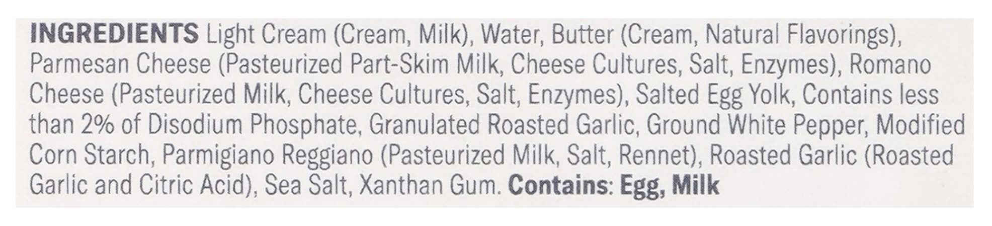Ingredients: Light Cream (Cream, Milk), Water, Butter (Cream, Natural Flavorings), Parmesan Cheese (Pasteurized Part-Skim Milk, Cheese Cultures, Salt, Enzymes), Romano Cheese (Pasteurized Milk, Cheese Cultures, Salt, Enzymes), Salted Egg Yolk, Contains Less than 2% of Disodium Phosphate, Granulated Roasted Garlic, Ground White Pepper, Modified Corn Starch, Parmigiano Reggiano (Pasteurized Milk, Salt, Rennet), Roasted Garlic (Roasted Garlic and Citric Acid), Sea Salt, Xanthan Gum Contains: Eggs, Milk