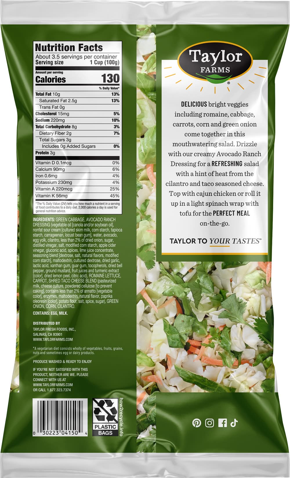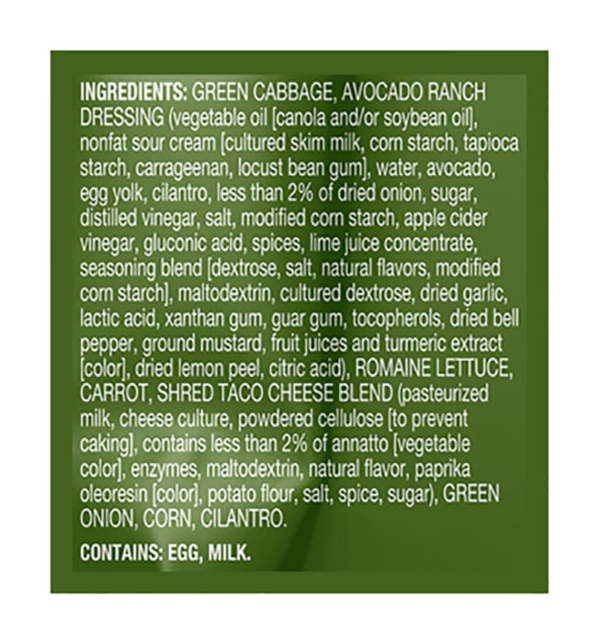 Ingredients: Green Cabbage, Avocado Ranch Dressing (Vegetable Oil [Canola and/or Soybean Oil], Nonfat Sour Cream [Cultured Skim Milk, Corn Starch, Tapioca Starch, Carrageenan, Locust Bean Gum], Water, Avocado, Egg Yolk, Cilantro, Less than 2% of Dried Onion, Sugar, Distilled Vinegar, Salt, Modified Corn Starch, Apple Cider Vinegar, Gluconic Acid, Spices, Lime Juice Concentrate, Seasoning Blend [Dextrose, Salt, Natural Flavors, Modified Corn Starch], Maltodextrin, Cultured Dextrose, Dried Garlic, Lactic Acid, Xanthan Gum, Guar Gum, Tocopherols, Dried Bell Pepper, Ground Mustard, Fruit Juices and Turmeric Extract [Color], Dried Lemon Peel, Citric Acid), Romaine Lettuce, Carrot, Shred Taco Cheese Blend (Pasteurized Milk, Cheese Culture, Powdered Cellulose [to Prevent Caking], Contains Less than 2% of Annatto [Vegetable Color], Enzymes, Maltodextrin, Natural Flavor, Paprika Oleoresin [Color], Potato Flour, Salt, Spice, Sugar), Green Onion, Corn, Cilantro Contains: Eggs, Milk, Corn, Soybeans