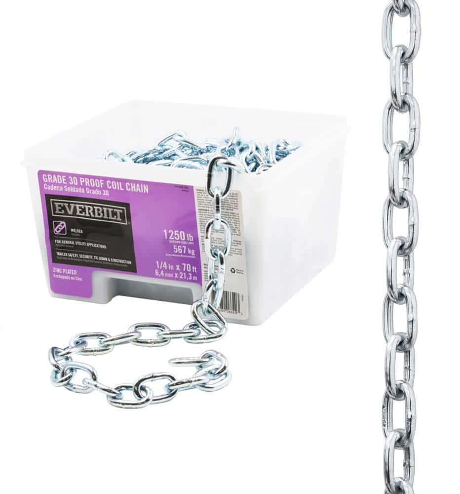 Grade 30 Proof Coil Chain is a heavy-duty, high strength, welded steel chain. It is designed for use in towing, binding, logging and other applications requiring high strength chain. Grade 30 is an excellent all-purpose commercial quality chain. Size: 1/4 in x 1 ft