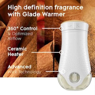 Get cozy with our Glade Apple Cinnamon PlugIns air freshener for home. Crafted by master perfumers with notes of McIntosh apple, cinnamon spice and sweet vanilla. Spice things up with our scent diffuser and change the mood with 2x more adjustability (vs. previous Glade warmer). Express your mood with electric oil diffuser in Apple Cinnamon fragrance. Simply remove the cap from the refill and insert it into the Glade plug in warmer. Plug the warmer into an outlet and adjust the level of fragrance to create the mood you want. Feel right at home with Glade's PlugIn air freshener and fragrance infused with essential oils. S.C. Johnson & Son, Inc., Racine, WI, 53403-2236