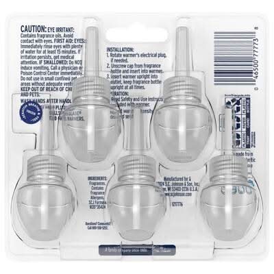 Installation: 1. rotate warmer's electrical plug, if needed. 2. unscrew cap from fragrance bottle and insert into warmer. 3. insert warmer upright into outlet, keep fragrance bottle upright at all times. operation: 4. read safety and use instructions included with warmer. adjust warmer intensity to desired setting. wash hands after handling. use only glade plugins scented oil refills in glade plugins scented oil warmers. refills compatible with.caution: eye irritant. read back panel carefully. caution: eye irritant: contains fragrance oils. avoid contact with eyes. first aid: eyes: immediately rinse with plenty of water for at least 15 minutes. if irritation persists, get medical attention. if swallowed: do not induce vomiting. call a physician or poison control center immediately. do not use in small confined pet areas without adequate ventilation. keep out of reach of children and pets.