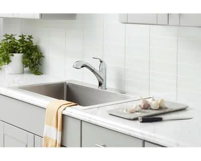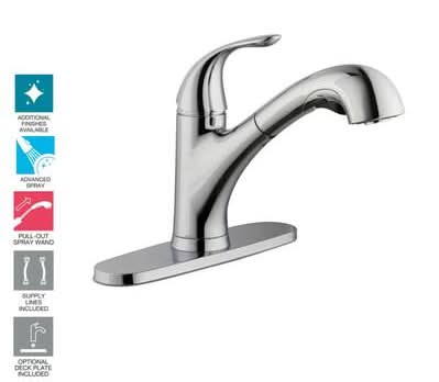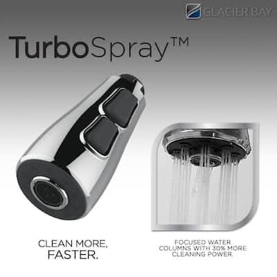 The Glacier Bay Market Pull-Out Kitchen Faucet in Chrome has durable metal construction to ensure long-lasting performance and enjoyment. Its single lever handle meets ADA standards for ease of use in adjusting water temperature and volume. The pull-out sprayer features an aerated spray and a new TurboSpray that is exclusive to Glacier Bay. The TurboSpray from Glacier Bay provides a stronger spray pattern than your standard pullout faucet. The sprayer also includes a 29.5 in. braided supply hose with a workable length of 25.2 in. for an extended reach, making it ideal for filling large pots and pans or washing down the sink. This kitchen faucet also includes the exclusive FastMount mounting system to make installation quicker and easier. Color: Polished chrome