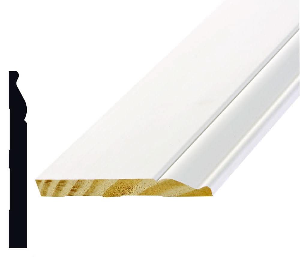 The Alexandria Moulding 9/16 in. x 5-1/4 in. Primed Pine Finger-Jointed Base Moulding has a subtly detailed face and rounded edge to harmonize with existing decor. It hides gaps and protects against kicks and bumps when fas Drilling, sawing, sanding or machining wood products can expose you to wood dust, a substance known to the State of California to cause cancer. Avoid inhaling wood dust or use a dust mask or other safeguards for personal protection. For more information go to www.P65Warnings.ca.gov/wood
