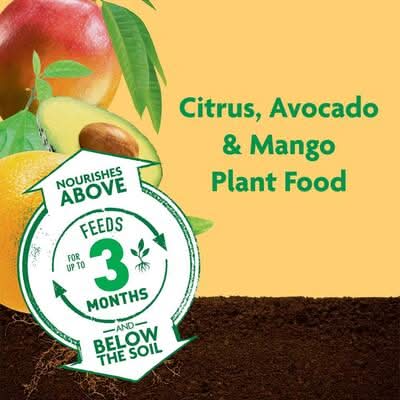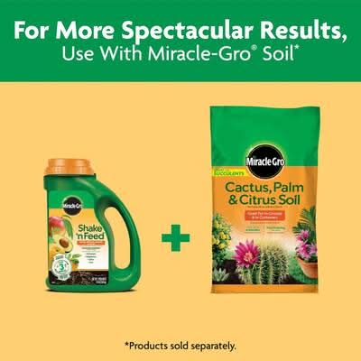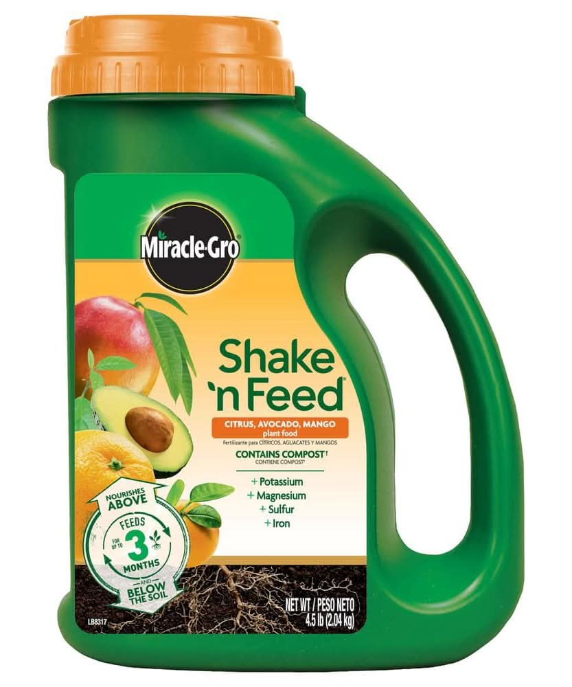 Nurture some of the sweetest plants in your garden with Miracle-Gro Shake 'N Feed Citrus, Avocado, Mango Plant Food. This citrus plant food feeds plants for up to 3 months and nourishes above and below the soil. This gardening product contains added potassium, magnesium, sulfur and iron to help improve common nutrient deficiencies. In addition, microbes break down compost in the plant food into nutrients that support root strength and development, which increases water efficiency and grows strong plants. Use with in-ground and container citrus, avocado, and mango plants. To apply to in-ground plants, shake evenly onto the soil within the spread of the branches, avoiding contact with the trunk and foliage. Work into the top 1-3 inches of soil, and water to start feeding. For container plants, mix into the soil at the time of planting, or shake evenly onto the soil and lightly work in for established plants. Water to start feeding. For a beautiful garden all season long, reapply Miracle-Gro Shake 'N Feed Citrus, Avocado, Mango Plant Food every 3 months and water plants regularly.
