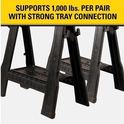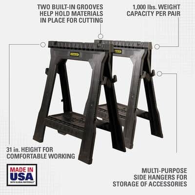 The Stanley Portable Folding Sawhorse secures your sawing surface. These sawhorses are collapsible for easy transporting and storage. When used as a pair, this lightweight and sturdy sawhorse twin pack can hold 1,000 lbs.