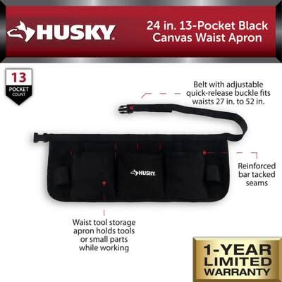 The Husky 24 in. Black Canvas Waist Apron is a great way to hold small tools and other items while working on projects around the house, garage, or in the shop. This black canvas waist apron is constructed of heavy-duty canvas and has 13 pockets. The black canvas waist apron also features b THIS PRODUCT CAN EXPOSE YOU TO DI(2-ETHYLHEXYL) PHTHALATE (DEHP), WHICH IS KNOWN TO THE STATE OF CALIFORNIA TO CAUSE CANCER AND BIRTH DEFECTS OR OTHER REPRODUCTIVE HARM. For more information go to www.P65Warnings.ca.gov • Color: Black • Size: 24 in