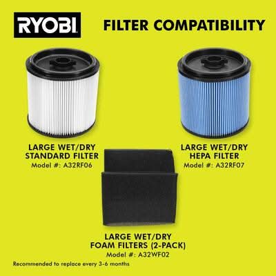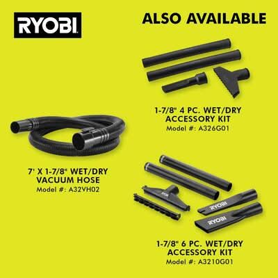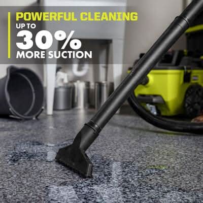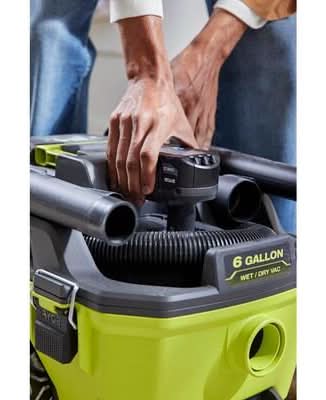Enhance your RYOBI 18V ONE+ System with the 18V 6 Gallon Wet/Dry Vacuum. This vacuum delivers powerful jobsite cleaning with up to 30% more suction power than the previous model. The all-terrain wheel design gives you confidence that this vacuum can handle common jobsite obstacles, saving you time on the job. The integrated storage allows you to store the included accessories for easy access. The 7’ hose gives you additional reach and the crevice tool Cancer and Reproductive Harm - www.p65warnings.ca.gov