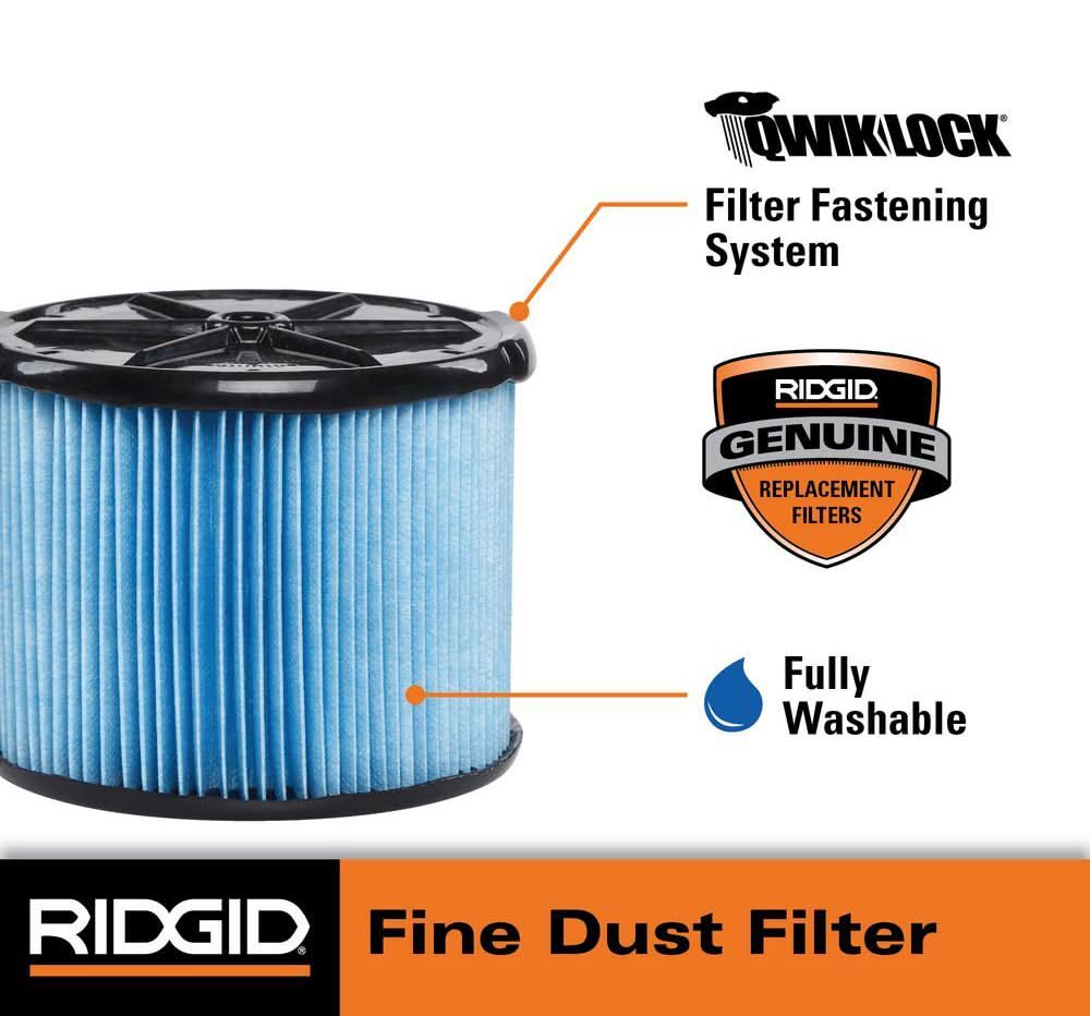 The RIDGID fine dust pleated paper replacement filter is designed for your RIDGID wet dry vacuum (3 - 4.5 gal.) to capture fine dust and trap particles such as mold, fine powders and cool fireplace ash. The RIDGID wet dry vac filter can be washed and, if dried properly, reused. Changing shop vac filters often is strongly recommended to increase the vac's performance and to help extend vacuum life as it protects the motor from harmful dust and debris. This product offers one fine dust filter that fits RIDGID wet dry shop vacs 3 gal. to 4.5 gal. along with the RIDGID Ash and Grilling Vacuum (HDAV0500) and should only be used for dry pickup. With its patented Qwik Lock feature, the filter simply snaps on or off the vacuum for easy cleaning and to quickly switch filter options. RIDGID provides other filtration offerings, including VF3600 HEPA Material Filter (sold separately), VF3700 Wet Application Filter (sold separately), and VF3800 HEPA Filter (sold separately), depending on the job application and type of cleanup mess. Also, value pack sizes (4-count and 8-count) are available to accommodate a variety of project needs.