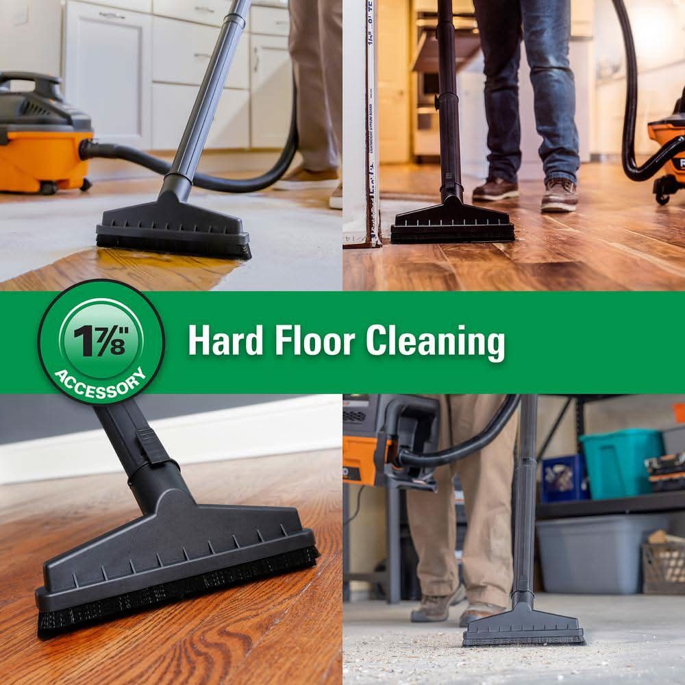 RIDGID makes cleaning a breeze with specialized RIDGID wet dry shop vac accessories such as the 1-7/8 in. Floor Brush for RIDGID wet dry shop vacuums. When connected to a RIDGID wet dry vac, the 1-7/8 in. shop vac floor brush is ideal for large surface areas and general hard floor cleanup such as basements and garages. The wet dry shop vac attachment has a bristle insert that is removable and configurable for either a pushing or pulling motion. RIDGID wet dry vacs also offers other shop vac attachments such as the extension wand (VT1708) for extended reach of hard-to-get-to areas, the dusting brush (VT1701) for delicate surface cleaning and other more niche shop vac accessories. RIDGID has you covered. Pro Tip: Add a RIDGID filter (sold separately) to a RIDGID shop vac to maintain the power of the vac and extend wet dry vacuum life. Add a RIDGID dust bag (sold separately) to the shop vacuum to help keep the wet dry vac drum clean and for quick pickups. • Color: Black • Size: 1-7/8 In