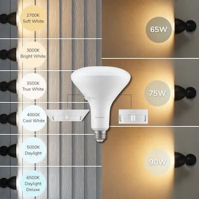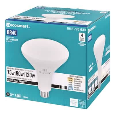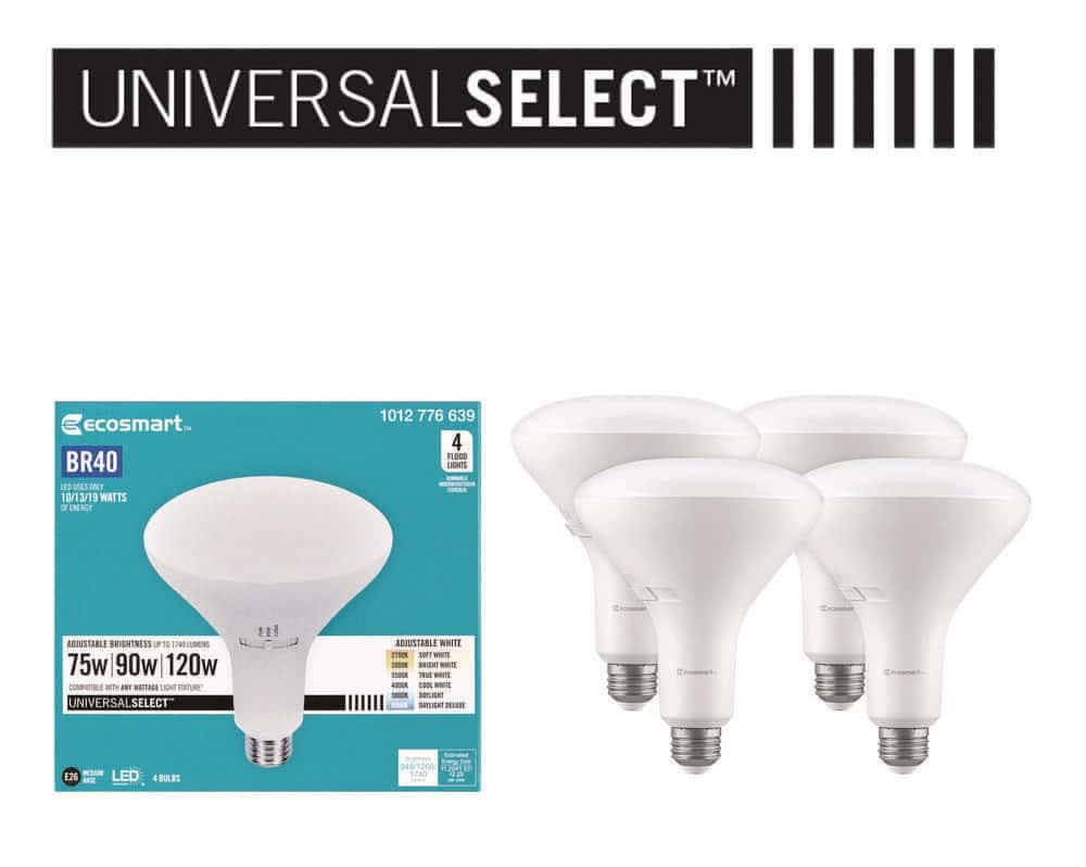 Introducing Ecosmart Universal Select. These BR40 LED bulbs are designed to replace any BR40 in your home. Take the guess work out of finding the perfect replacement LED bulb. Each of these LED bulbs are equipped with 2-switches. You can select your preferred color temperature by adjusting the switch on the neck of the bulb. Not sure what color you prefer? That's why this bulb is equipped with 6-color temperatures so you can decide what best suits your needs. This LED BR40 bulb is also equipped with a switch to select the max wattage equivalent level and lumen output. This is so you can find the perfect brightness to meet your needs. The Universal Select LED BR40 bulb is perfect for replacing any of your current BR40s. It contains all the specs inside a single bulb so you don't need to worry about finding the perfect replacement. You can adjust the settings at home to create the perfect bulb to suit your needs. Rated to last for 15,000 hours, dimmable and suitable for enclosed fixtures. Backed by Ecosmart's 5-year warranty.