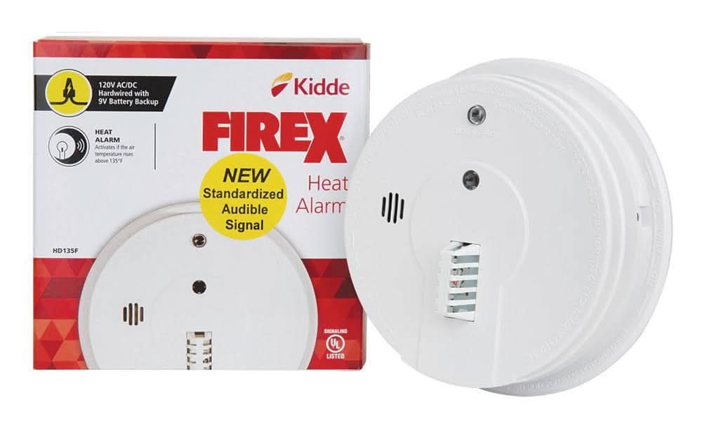 The Kidde FireX HD135F is a 120-Volt AC Wire In Heat Alarm that responds to temperature rather than smoke. The alarm will sound if temperatures rise above 135 degree F. The Kidde HD135 degree F is inter connectable. The interconnect system must not exceed the NFPA (National Fire Protection Association) limit of 18 initiating devices (Smoke, heat, CO, etc.) interconnected, it is still possible to interconnect 6 strobe lights and or relay modules. This unit includes a 5-year limited warranty and is UL Listed.