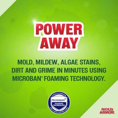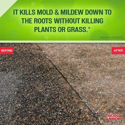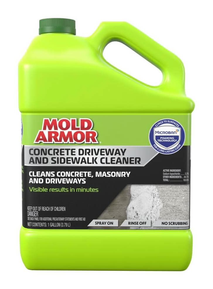 Clean up your outdoor spaces with Mold Armor Concrete Driveway and Sidewalk Cleaner. Mold Armor powers away mold, mildew, algae stains, dirt and grime - restoring your concrete, sidewalk or driveway's original look in minutes. The powerful formula kills mold and mildew down to the roots. Microban foaming technology helps to lift dirt and debris, then clings to the surface for a long-lasting clean. It's safe for use on concrete, sealed driveways, brick and sidewalks. Directions for use: 1) Apply full strength with a plastic garden sprayer. 2) Let stand 5-10 minutes to eliminate stains, 10 minutes to kill and remove mold and mildew. 3) Thoroughly rinse surface and surrounding area. Read all directions carefully before use. For outdoor use only. Oxidation can cause permanent discoloration on outside surfaces. Wear eye protection and rubber gloves during application. Keep out of reach of children.