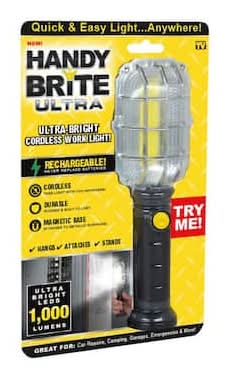 Introducing HANDY BRITE Ultra, the ultra-bright cordless LED work light. Get quick and easy light. anywhere. HANDY BRITE Ultra fills any space with a blanket of powerful, bright light wherever you need it. The secret is HANDY BRITE Ultra's ultra-bright LED bulbs that produce 1000 Lumens of light. HANDY BRITE Ultra's cordless design is hassle-free for all your important projects. No more messy wires getting in the way. The built-in stand lets you work handsfree. The flip up hook lets you hang it anywhere you need bright and wide light. Perfect for hanging it in the pantry or closet. Great for tasks in low lighting, tight spaces, and even emergencies. HANDY BRITE Ultra even has a powerful magnetic base that attaches to any metal surface. HANDY BRITE Ultra is compact and lightweight, so you can bring it with you anywhere. Keep it in your toolbox, glove box, or in your kitchen drawer. HANDY BRITE Ultra is rugged, durable, and built to last. HANDY BRITE Ultra's rubberized comfort grip is ergonomic and ensures a non-slip grip. HANDY BRITE Ultra is great for car repairs, camping, garages, emergencies, and more. HANDY BRITE Ultra is the ideal work light that brings ultra-bright light to any space.