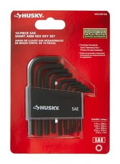 The Husky 10-Piece Short-Arm Hex Key Set features alloy steel construction for strength and durability. These keys have short arms and resist rotational distortion. This 10-piece set includes a range of SAE hex keys.