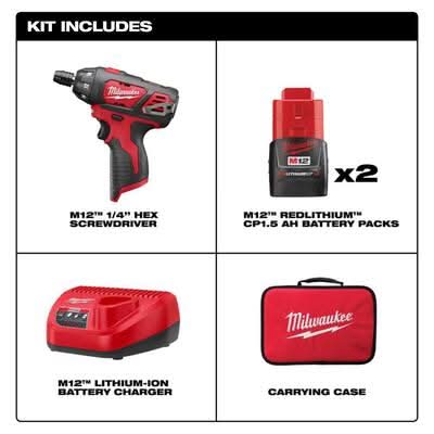 Milwaukee M12 12V Lithium-Ion Cordless 1/4 In. Hex Screwdriver Kit With Two 1.5Ah Batteries, Charger And Tool Bag
