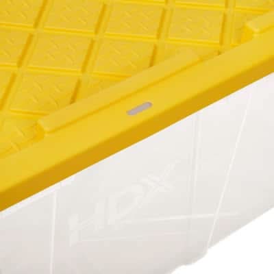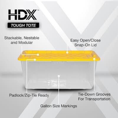 This heavy-duty HDX 57-gallon clear Tough Tote is designed to handle all your storage needs. The recessed lid enables you to stack multiple units effortlessly, while the tapered design facilitates easy nesting when you need to store them. With a sturdy clear base crafted from high-grade resin and a yellow snap lid, your items are safe and protected. Ideal for the thorough organizer seeking top-tier storage solutions, this tote features a clear resin base for added visibility of stored items and integrated slots for locking to deter unwanted access. Its unique tie-down channels also make it easy to secure for hassle-free transport and it's compatible with most hitch mounted cargo carriers. So that you can easily recognize what size your tote is, the gallon size is now clearly visible on both the base and the lid. Embrace the essence of organized living with HDX Tough Totes! Color: Yellow